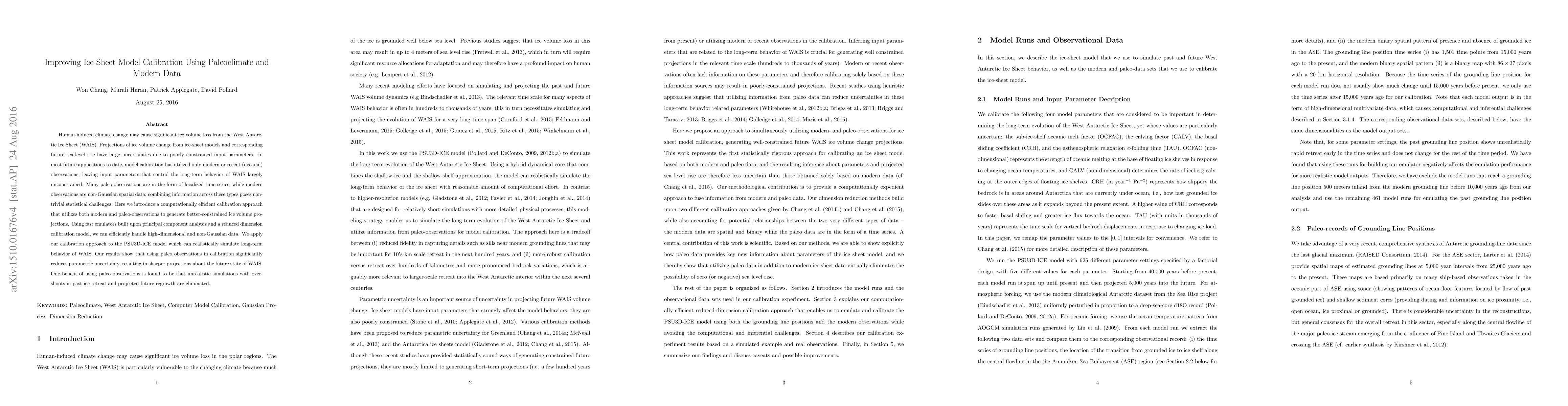 This paper proposes a new calibration method for ice sheet models using both modern and paleoclimate data, which significantly reduces uncertainties in projections of West Antarctic Ice Sheet behavior and future sea-level rise. The approach employs efficient emulators and reduced dimension models to handle complex, high-dimensional data.
