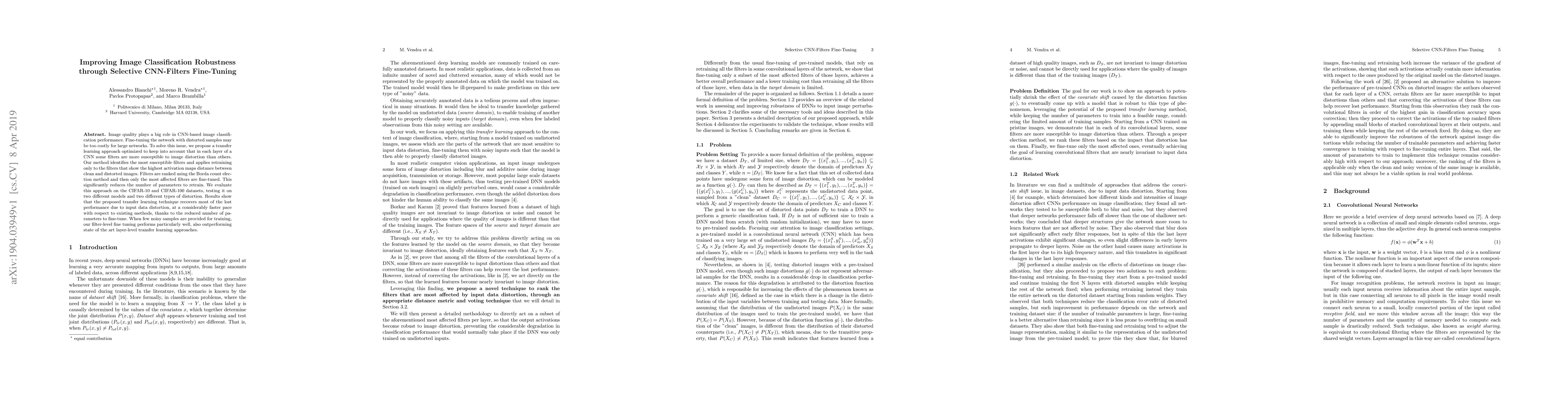 Image quality plays a big role in CNN-based image classification performance. Fine-tuning the network with distorted samples may be too costly for large networks. To solve this issue, we propose a transfer learning approach optimized to keep into account that in each layer of a CNN some filters are more susceptible to image distortion than others. Our method identifies the most susceptible filters and applies retraining only to the filters that show the highest activation maps distance between clean and distorted images. Filters are ranked using the Borda count election method and then only the most affected filters are fine-tuned. This significantly reduces the number of parameters to retrain. We evaluate this approach on the CIFAR-10 and CIFAR-100 datasets, testing it on two different models and two different types of distortion. Results show that the proposed transfer learning technique recovers most of the lost performance due to input data distortion, at a considerably faster pace with respect to existing methods, thanks to the reduced number of parameters to fine-tune. When few noisy samples are provided for training, our filter-level fine tuning performs particularly well, also outperforming state of the art layer-level transfer learning approaches.