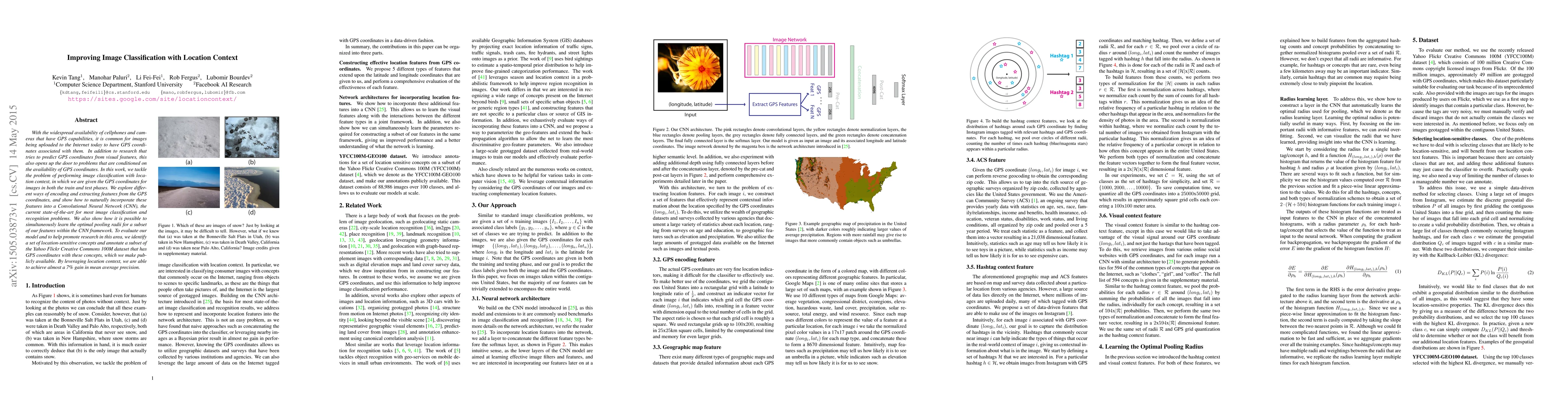 With the widespread availability of cellphones and cameras that have GPS capabilities, it is common for images being uploaded to the Internet today to have GPS coordinates associated with them. In addition to research that tries to predict GPS coordinates from visual features, this also opens up the door to problems that are conditioned on the availability of GPS coordinates. In this work, we tackle the problem of performing image classification with location context, in which we are given the GPS coordinates for images in both the train and test phases. We explore different ways of encoding and extracting features from the GPS coordinates, and show how to naturally incorporate these features into a Convolutional Neural Network (CNN), the current state-of-the-art for most image classification and recognition problems. We also show how it is possible to simultaneously learn the optimal pooling radii for a subset of our features within the CNN framework. To evaluate our model and to help promote research in this area, we identify a set of location-sensitive concepts and annotate a subset of the Yahoo Flickr Creative Commons 100M dataset that has GPS coordinates with these concepts, which we make publicly available. By leveraging location context, we are able to achieve almost a 7% gain in mean average precision.