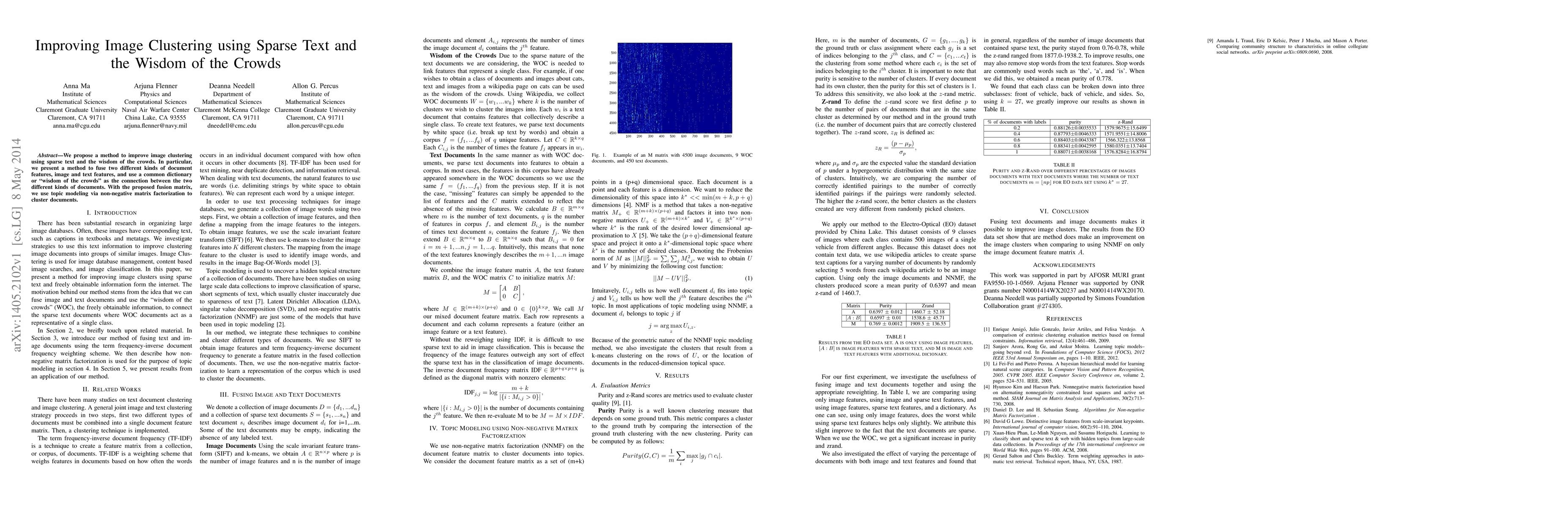 Researchers propose a method to improve image clustering using sparse text features and crowd-sourced wisdom, fusing document features with topic modeling for accurate clustering.