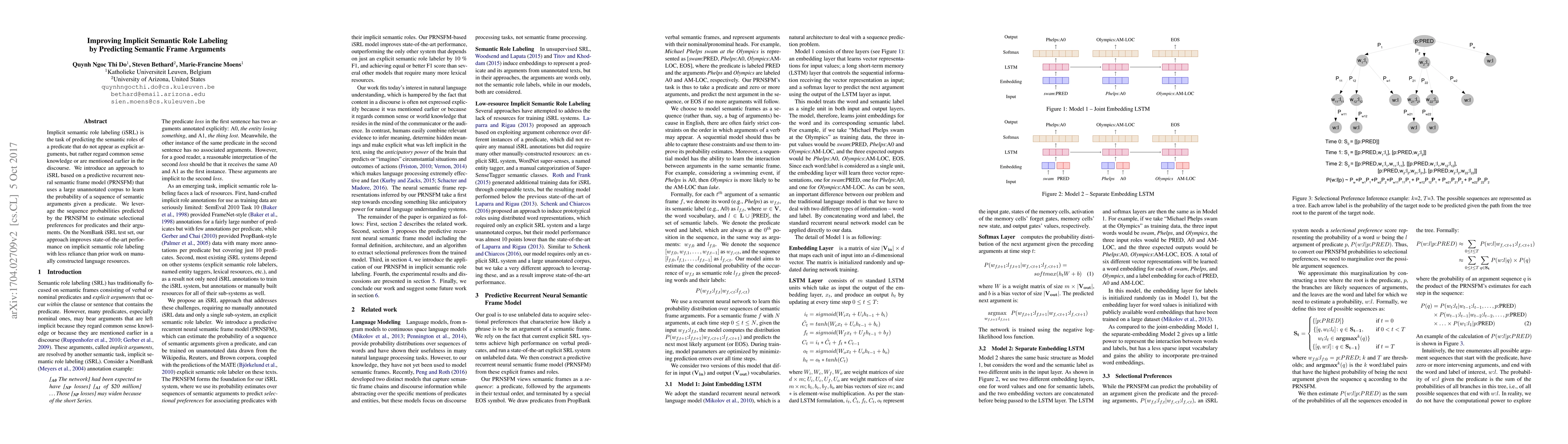 Summary: This paper introduces a predictive recurrent neural semantic frame model (PRNSFM) for implicit semantic role labeling (iSRL) that leverages unannotated corpora to learn argument sequences for predicates, improving state-of-the-art performance without heavily relying on manually constructed language resources.