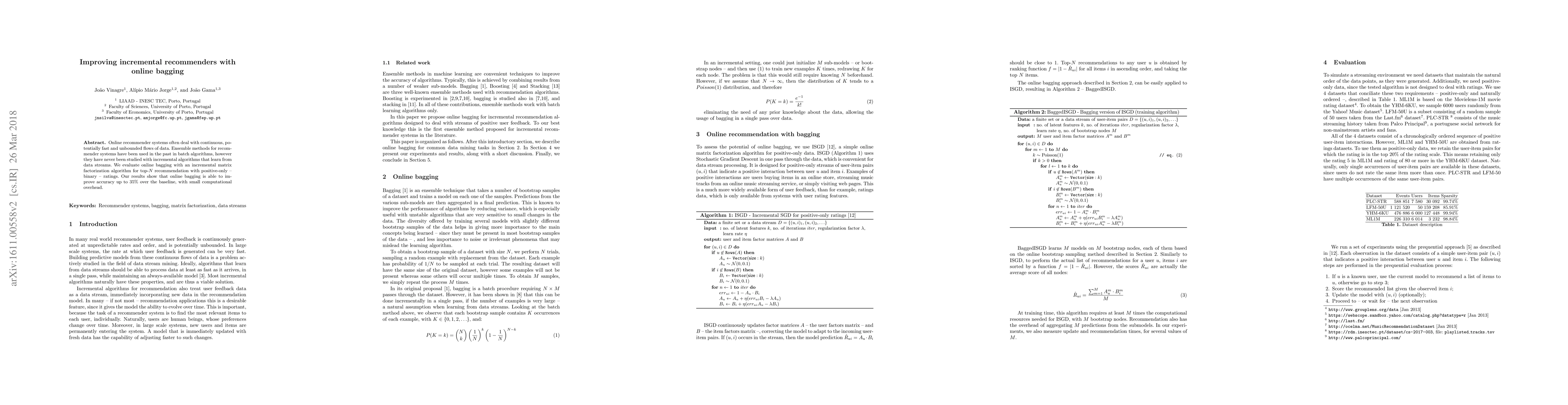Online recommender systems often deal with continuous, potentially fast and unbounded flows of data. Ensemble methods for recommender systems have been used in the past in batch algorithms, however they have never been studied with incremental algorithms that learn from data streams. We evaluate online bagging with an incremental matrix factorization algorithm for top-N recommendation with positive-only -- binary -- ratings. Our results show that online bagging is able to improve accuracy up to 35% over the baseline, with small computational overhead.
