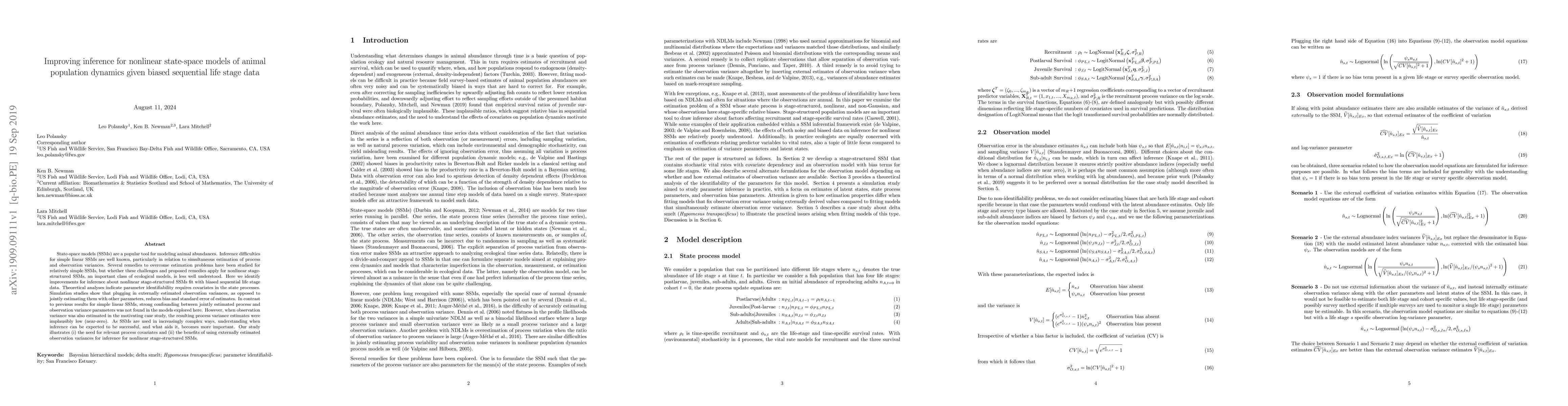 Researchers improve inference for nonlinear state-space models of animal population dynamics using biased sequential life stage data, finding that external observation variances reduce bias and standard error of estimates.