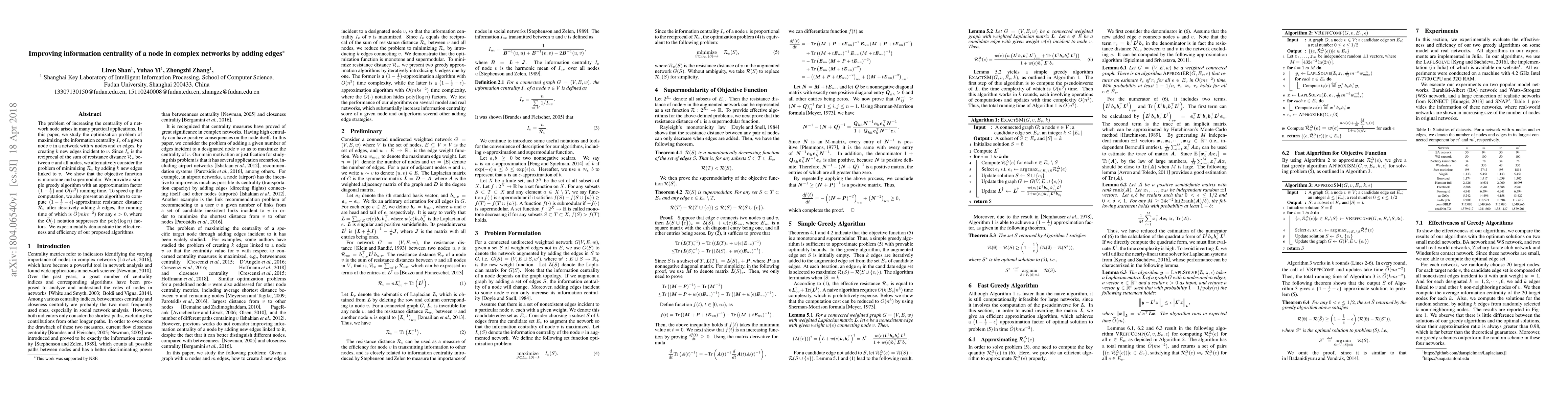 This paper proposes algorithms to maximize a node's information centrality in complex networks by adding new edges. It presents a greedy algorithm with an approximation factor of $(1-\frac{1}{e})$ and an efficient approximation method for resistance distance computation, demonstrating their effectiveness through experiments.