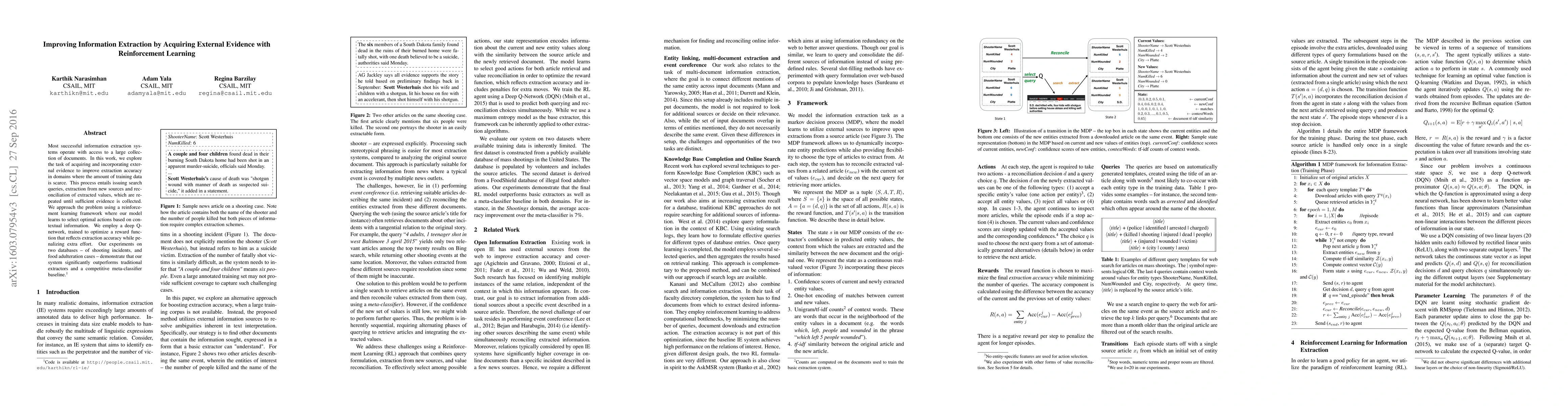 Most successful information extraction systems operate with access to a large collection of documents. In this work, we explore the task of acquiring and incorporating external evidence to improve extraction accuracy in domains where the amount of training data is scarce. This process entails issuing search queries, extraction from new sources and reconciliation of extracted values, which are repeated until sufficient evidence is collected. We approach the problem using a reinforcement learning framework where our model learns to select optimal actions based on contextual information. We employ a deep Q-network, trained to optimize a reward function that reflects extraction accuracy while penalizing extra effort. Our experiments on two databases -- of shooting incidents, and food adulteration cases -- demonstrate that our system significantly outperforms traditional extractors and a competitive meta-classifier baseline.