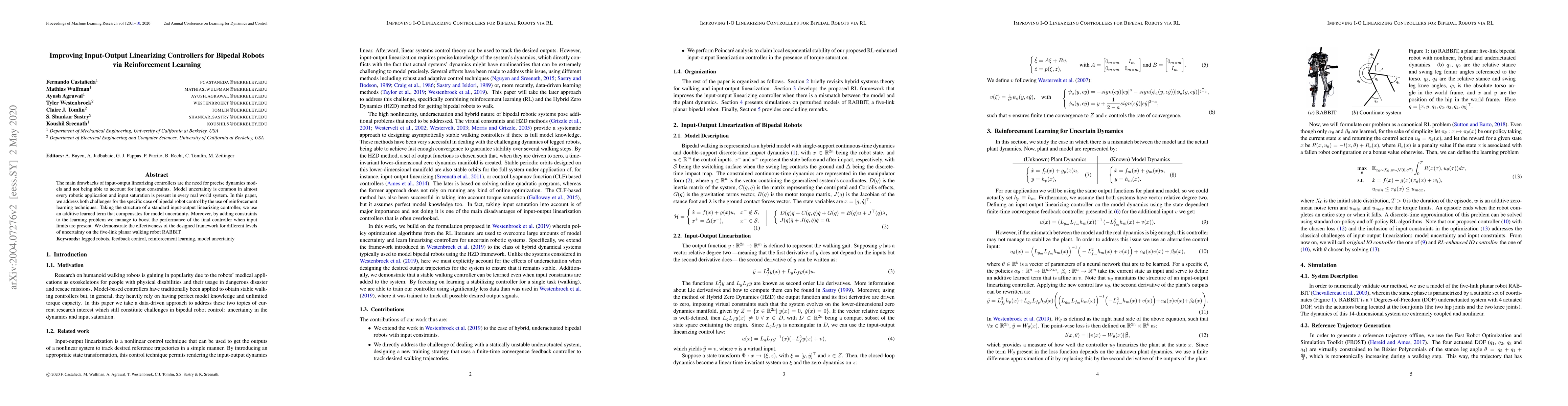 The main drawbacks of input-output linearizing controllers are the need for precise dynamics models and not being able to account for input constraints. Model uncertainty is common in almost every robotic application and input saturation is present in every real world system. In this paper, we address both challenges for the specific case of bipedal robot control by the use of reinforcement learning techniques. Taking the structure of a standard input-output linearizing controller, we use an additive learned term that compensates for model uncertainty. Moreover, by adding constraints to the learning problem we manage to boost the performance of the final controller when input limits are present. We demonstrate the effectiveness of the designed framework for different levels of uncertainty on the five-link planar walking robot RABBIT.