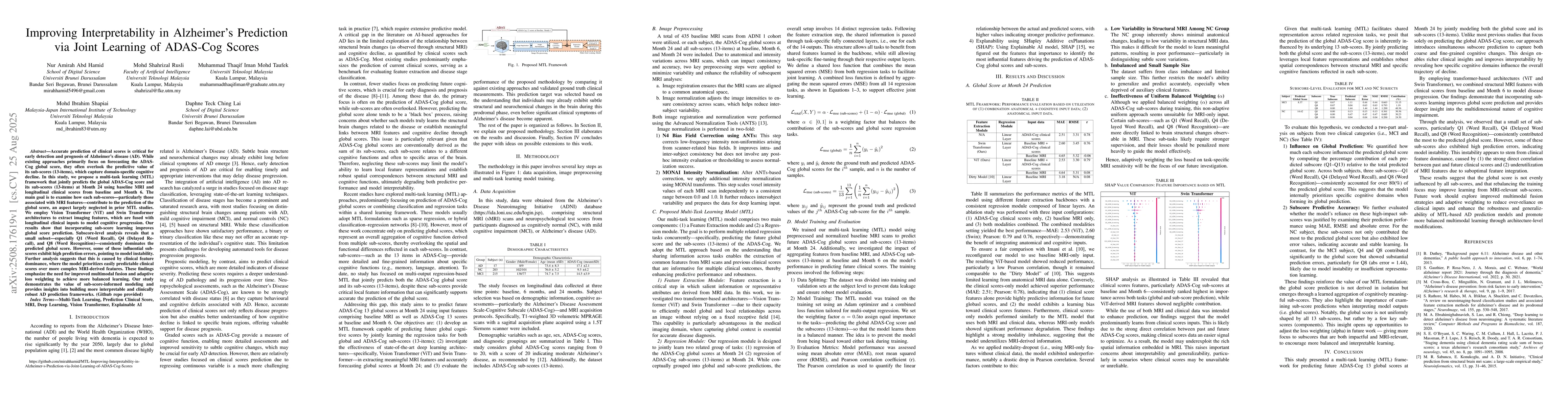 Accurate prediction of clinical scores is critical for early detection and prognosis of Alzheimers disease (AD). While existing approaches primarily focus on forecasting the ADAS-Cog global score, they often overlook the predictive value of its sub-scores (13 items), which capture domain-specific cognitive decline. In this study, we propose a multi task learning (MTL) framework that jointly predicts the global ADAS-Cog score and its sub-scores (13 items) at Month 24 using baseline MRI and longitudinal clinical scores from baseline and Month 6. The main goal is to examine how each sub scores particularly those associated with MRI features contribute to the prediction of the global score, an aspect largely neglected in prior MTL studies. We employ Vision Transformer (ViT) and Swin Transformer architectures to extract imaging features, which are fused with longitudinal clinical inputs to model cognitive progression. Our results show that incorporating sub-score learning improves global score prediction. Subscore level analysis reveals that a small subset especially Q1 (Word Recall), Q4 (Delayed Recall), and Q8 (Word Recognition) consistently dominates the predicted global score. However, some of these influential sub-scores exhibit high prediction errors, pointing to model instability. Further analysis suggests that this is caused by clinical feature dominance, where the model prioritizes easily predictable clinical scores over more complex MRI derived features. These findings emphasize the need for improved multimodal fusion and adaptive loss weighting to achieve more balanced learning. Our study demonstrates the value of sub score informed modeling and provides insights into building more interpretable and clinically robust AD prediction frameworks. (Github repo provided)
