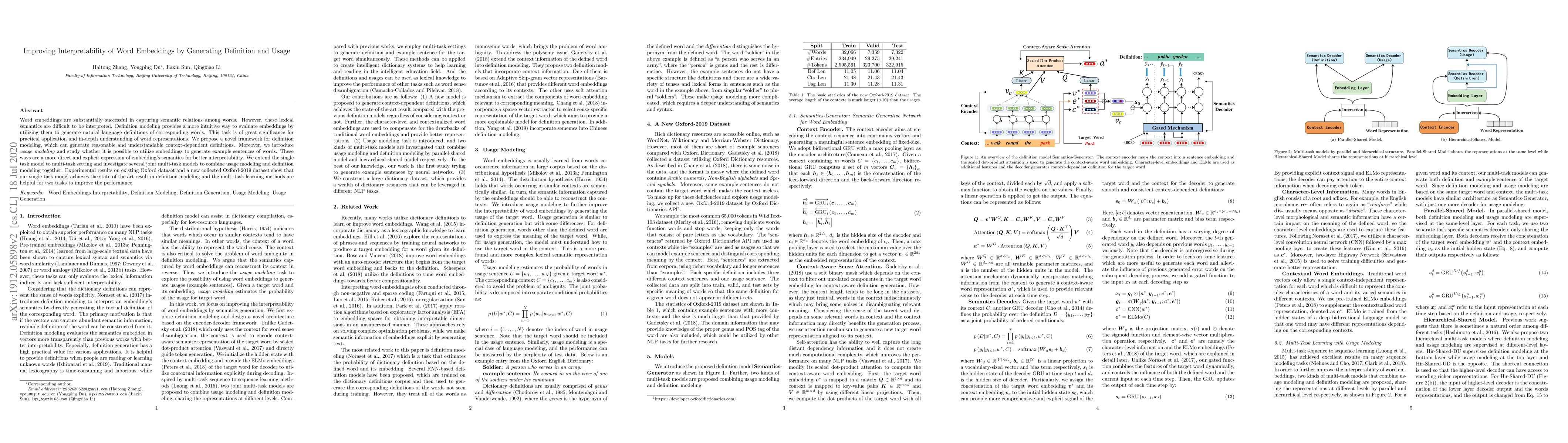 This paper proposes a framework for generating natural language definitions and example sentences from word embeddings to improve their interpretability. The multi-task learning approach combining definition modeling and usage modeling achieves state-of-the-art results and enhances the understanding of word representations.