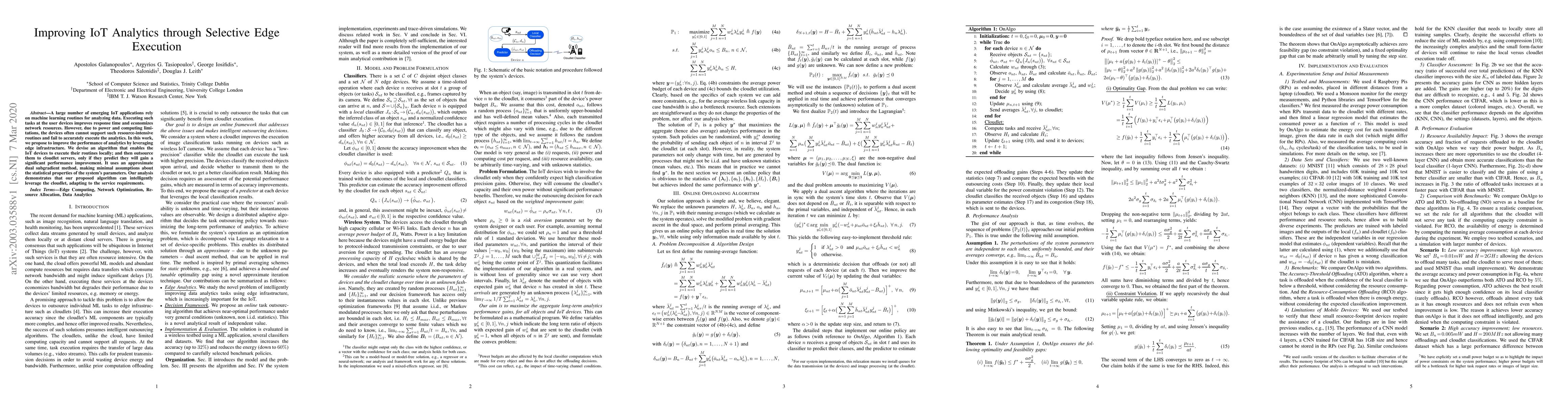 A large number of emerging IoT applications rely on machine learning routines for analyzing data. Executing such tasks at the user devices improves response time and economizes network resources. However, due to power and computing limitations, the devices often cannot support such resource-intensive routines and fail to accurately execute the analytics. In this work, we propose to improve the performance of analytics by leveraging edge infrastructure. We devise an algorithm that enables the IoT devices to execute their routines locally; and then outsource them to cloudlet servers, only if they predict they will gain a significant performance improvement. It uses an approximate dual subgradient method, making minimal assumptions about the statistical properties of the system's parameters. Our analysis demonstrates that our proposed algorithm can intelligently leverage the cloudlet, adapting to the service requirements.