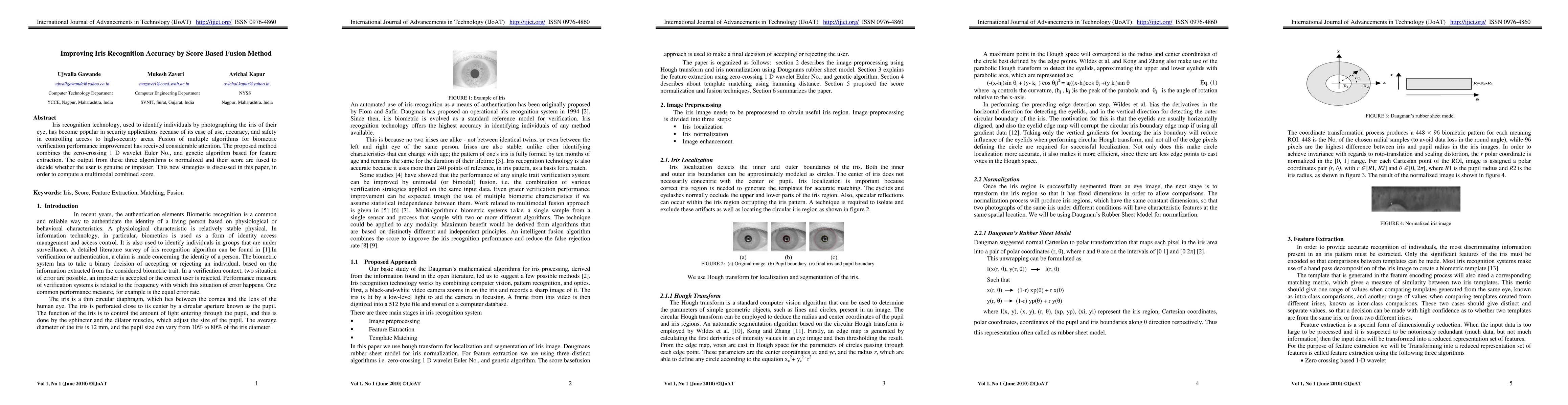 Iris recognition technology, used to identify individuals by photographing the iris of their eye, has become popular in security applications because of its ease of use, accuracy, and safety in controlling access to high-security areas. Fusion of multiple algorithms for biometric verification performance improvement has received considerable attention. The proposed method combines the zero-crossing 1 D wavelet Euler number, and genetic algorithm based for feature extraction. The output from these three algorithms is normalized and their score are fused to decide whether the user is genuine or imposter. This new strategies is discussed in this paper, in order to compute a multimodal combined score.