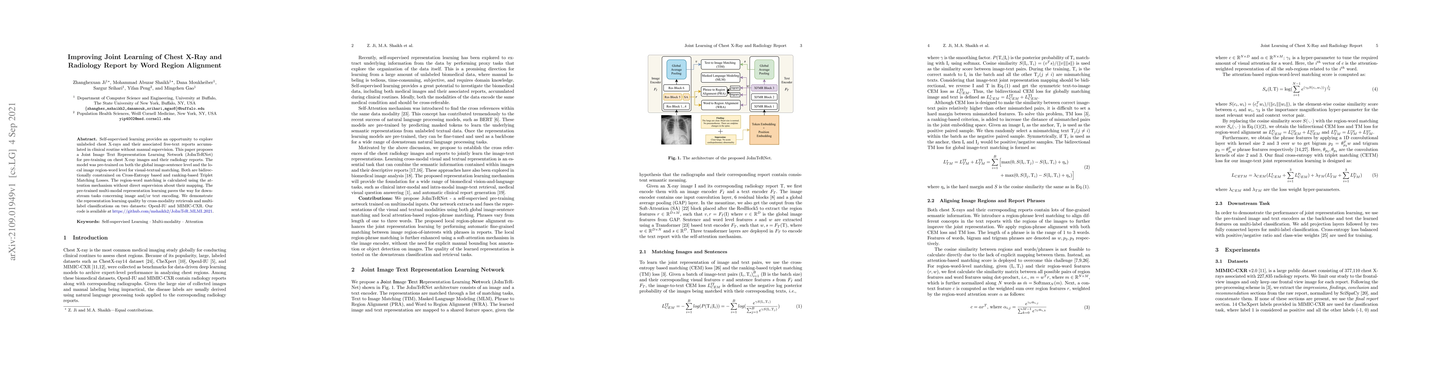 This paper proposes JoImTeRNet, a Joint Image Text Representation Learning Network for pre-training on chest X-rays and radiology reports using self-supervised learning. It employs region-word alignment via attention mechanisms to enhance visual-textual matching, demonstrating improved performance in cross-modality retrieval and multi-label classification tasks.