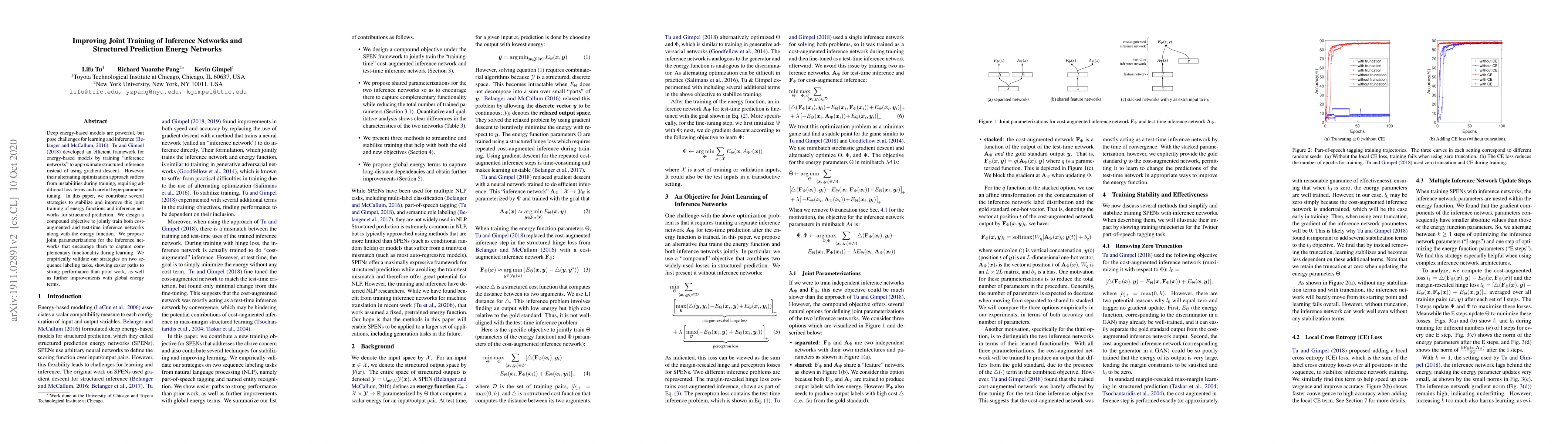 This paper proposes strategies to stabilize and improve the joint training of energy functions and inference networks for structured prediction, addressing the instabilities in prior frameworks. The authors introduce a compound objective and joint parameterizations, and demonstrate improved performance on sequence labeling tasks compared to previous methods.