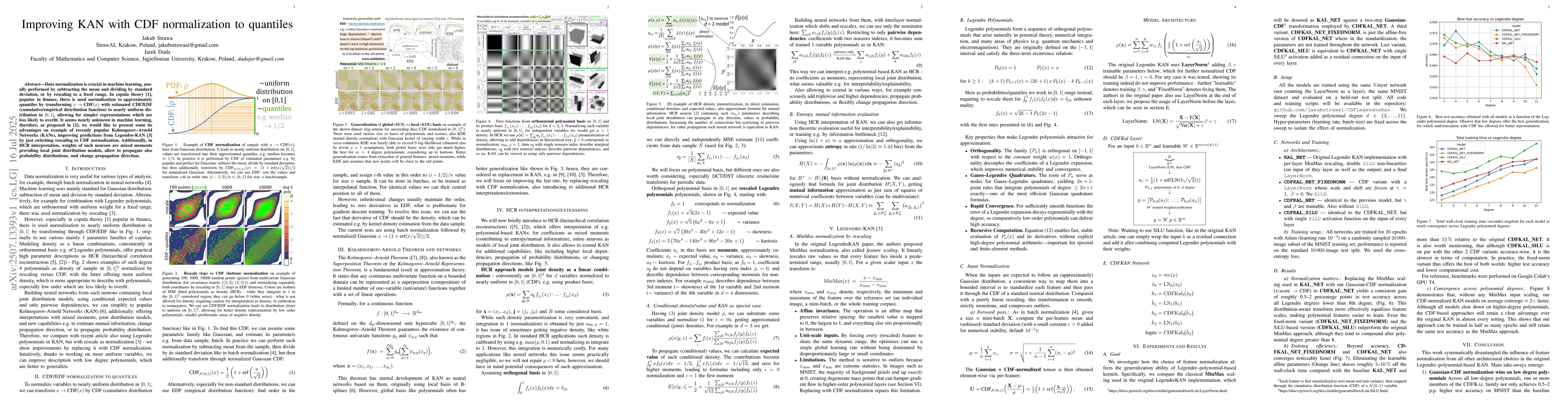 Data normalization is crucial in machine learning, usually performed by subtracting the mean and dividing by standard deviation, or by rescaling to a fixed range. In copula theory, popular in finance, there is used normalization to approximately quantiles by transforming x to CDF(x) with estimated CDF (cumulative distribution function) to nearly uniform distribution in [0,1], allowing for simpler representations which are less likely to overfit. It seems nearly unknown in machine learning, therefore, we would like to present some its advantages on example of recently popular Kolmogorov-Arnold Networks (KANs), improving predictions from Legendre-KAN by just switching rescaling to CDF normalization. Additionally, in HCR interpretation, weights of such neurons are mixed moments providing local joint distribution models, allow to propagate also probability distributions, and change propagation direction.
