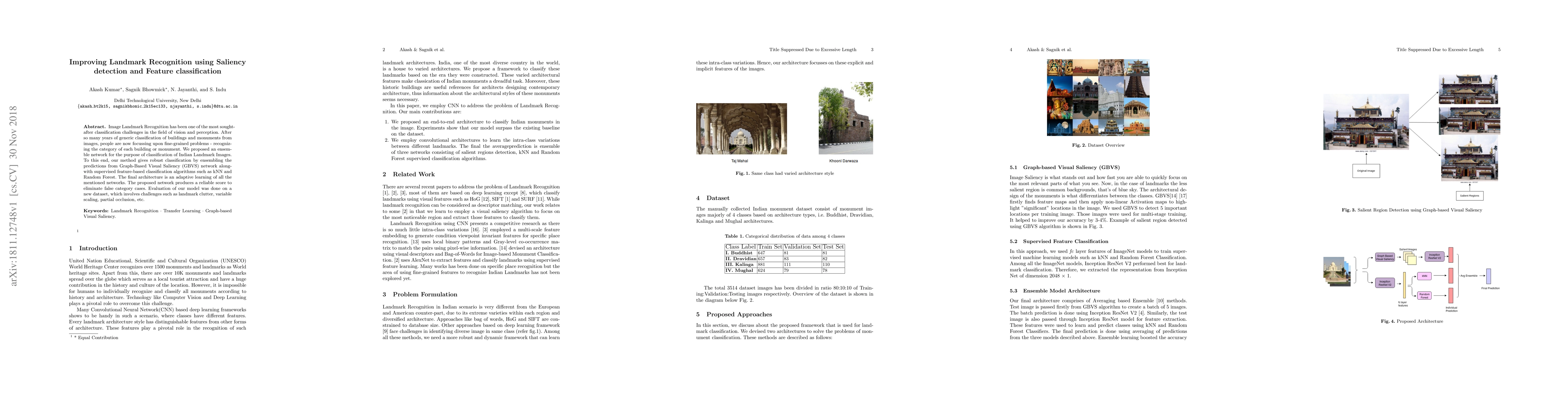 Image Landmark Recognition has been one of the most sought-after classification challenges in the field of vision and perception. After so many years of generic classification of buildings and monuments from images, people are now focussing upon fine-grained problems - recognizing the category of each building or monument. We proposed an ensemble network for the purpose of classification of Indian Landmark Images. To this end, our method gives robust classification by ensembling the predictions from Graph-Based Visual Saliency (GBVS) network alongwith supervised feature-based classification algorithms such as kNN and Random Forest. The final architecture is an adaptive learning of all the mentioned networks. The proposed network produces a reliable score to eliminate false category cases. Evaluation of our model was done on a new dataset, which involves challenges such as landmark clutter, variable scaling, partial occlusion, etc.
