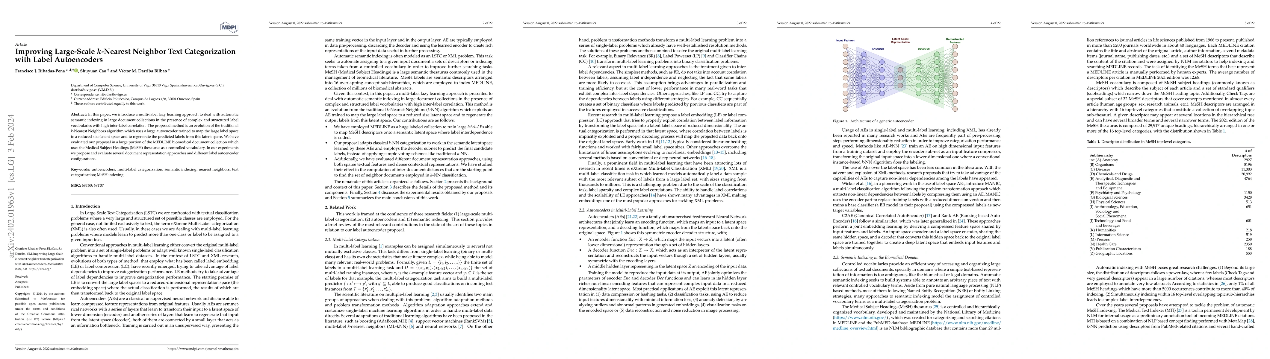This paper proposes a multi-label lazy learning approach for large-scale text categorization using k-Nearest Neighbors enhanced by a label autoencoder. The autoencoder reduces the complex label space and regenerates predicted labels, evaluated on the MEDLINE collection using MeSH thesaurus.