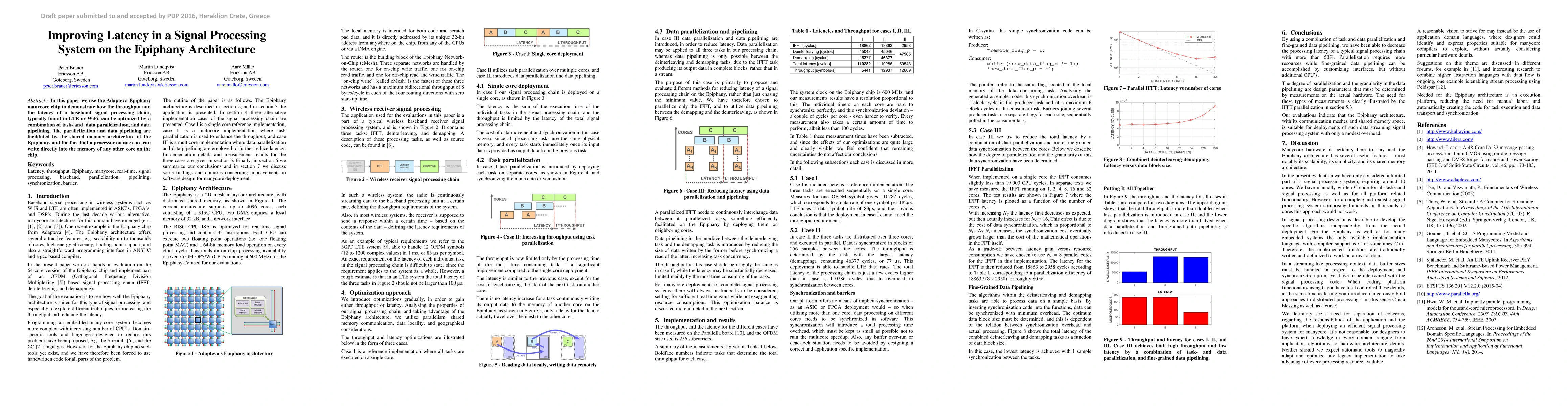 In this paper we use the Adapteva Epiphany manycore chip to demonstrate how the throughput and the latency of a baseband signal processing chain, typically found in LTE or WiFi, can be optimized by a combination of task- and data parallelization, and data pipelining. The parallelization and data pipelining are facilitated by the shared memory architecture of the Epiphany, and the fact that a processor on one core can write directly into the memory of any other core on the chip.