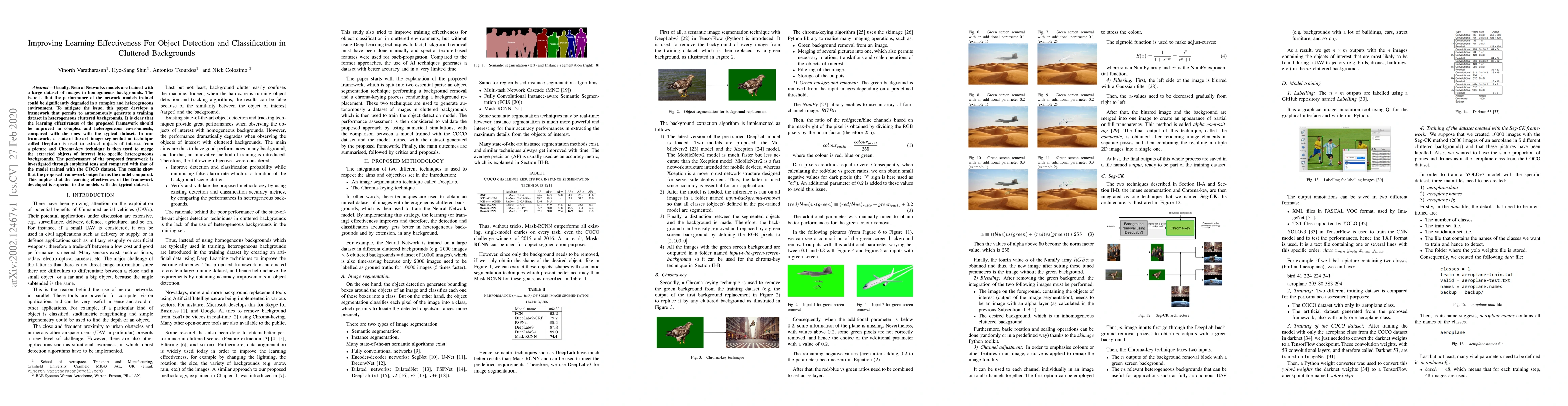 Usually, Neural Networks models are trained with a large dataset of images in homogeneous backgrounds. The issue is that the performance of the network models trained could be significantly degraded in a complex and heterogeneous environment. To mitigate the issue, this paper develops a framework that permits to autonomously generate a training dataset in heterogeneous cluttered backgrounds. It is clear that the learning effectiveness of the proposed framework should be improved in complex and heterogeneous environments, compared with the ones with the typical dataset. In our framework, a state-of-the-art image segmentation technique called DeepLab is used to extract objects of interest from a picture and Chroma-key technique is then used to merge the extracted objects of interest into specific heterogeneous backgrounds. The performance of the proposed framework is investigated through empirical tests and compared with that of the model trained with the COCO dataset. The results show that the proposed framework outperforms the model compared. This implies that the learning effectiveness of the framework developed is superior to the models with the typical dataset.