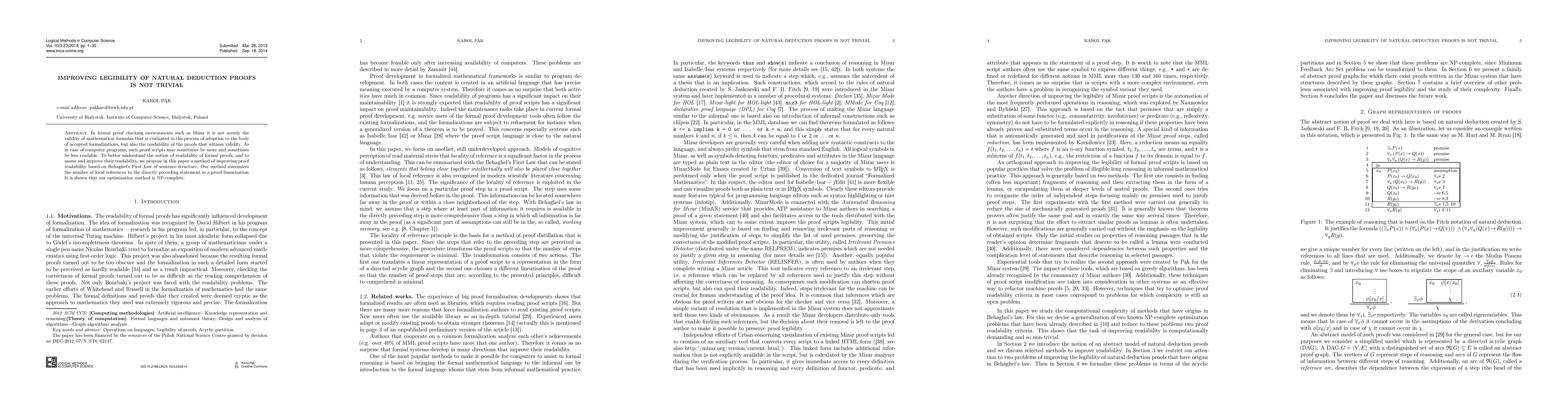 In formal proof checking environments such as Mizar it is not merely the validity of mathematical formulas that is evaluated in the process of adoption to the body of accepted formalizations, but also the readability of the proofs that witness validity. As in case of computer programs, such proof scripts may sometimes be more and sometimes be less readable. To better understand the notion of readability of formal proofs, and to assess and improve their readability, we propose in this paper a method of improving proof readability based on Behaghel's First Law of sentence structure. Our method maximizes the number of local references to the directly preceding statement in a proof linearisation. It is shown that our optimization method is NP-complete.