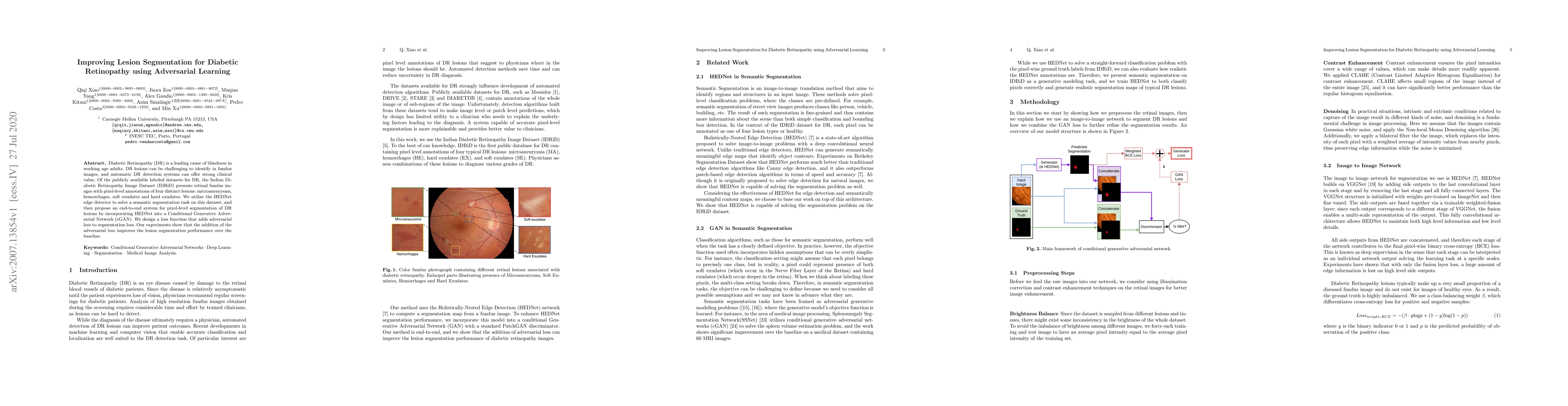 This paper proposes an end-to-end system for segmenting diabetic retinopathy lesions using a Conditional Generative Adversarial Network (cGAN) integrated with HEDNet edge detection. The adversarial loss enhances segmentation performance, outperforming baseline methods.