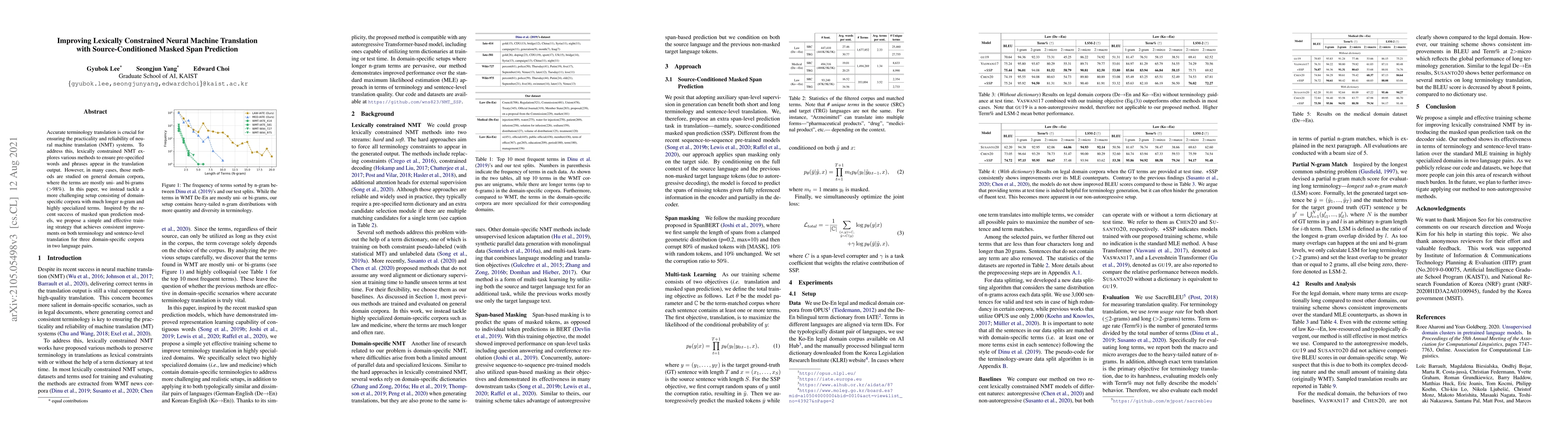This paper proposes a novel training strategy using source-conditioned masked span prediction to enhance lexically constrained neural machine translation for domain-specific corpora with long n-grams and specialized terms. The method consistently improves both terminology and overall translation accuracy across three domain-specific corpora in two language pairs.