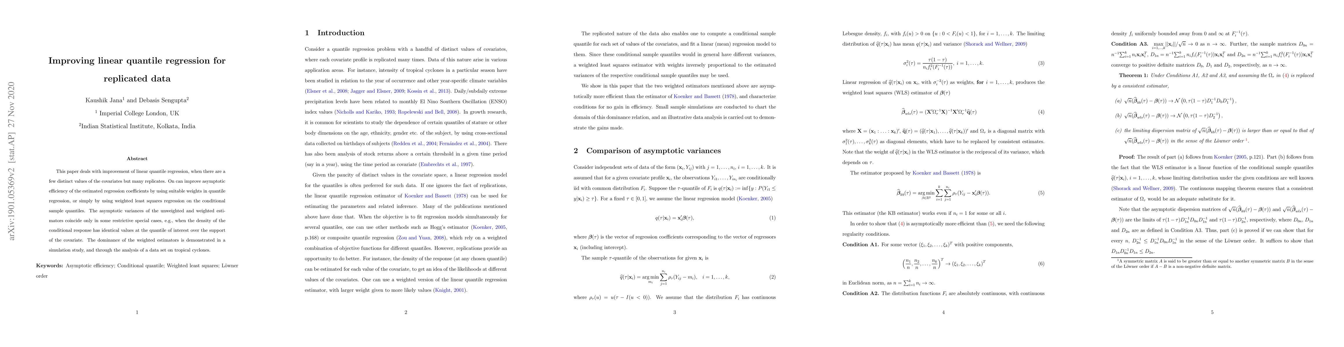 This paper proposes improved methods for linear quantile regression in scenarios with replicated data, demonstrating that weighted estimators enhance asymptotic efficiency. Simulation studies and a tropical cyclone dataset analysis show the superiority of weighted over unweighted estimators.