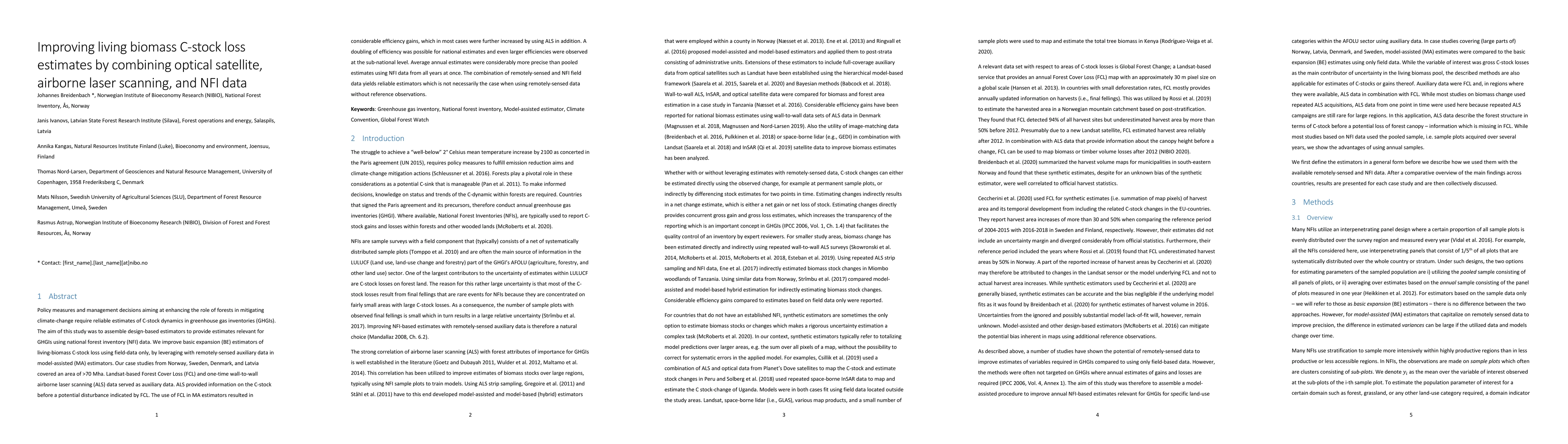 This study improves estimates of living biomass C-stock loss using satellite and airborne laser scanning data in conjunction with national forest inventory data, resulting in more precise and efficient estimates.