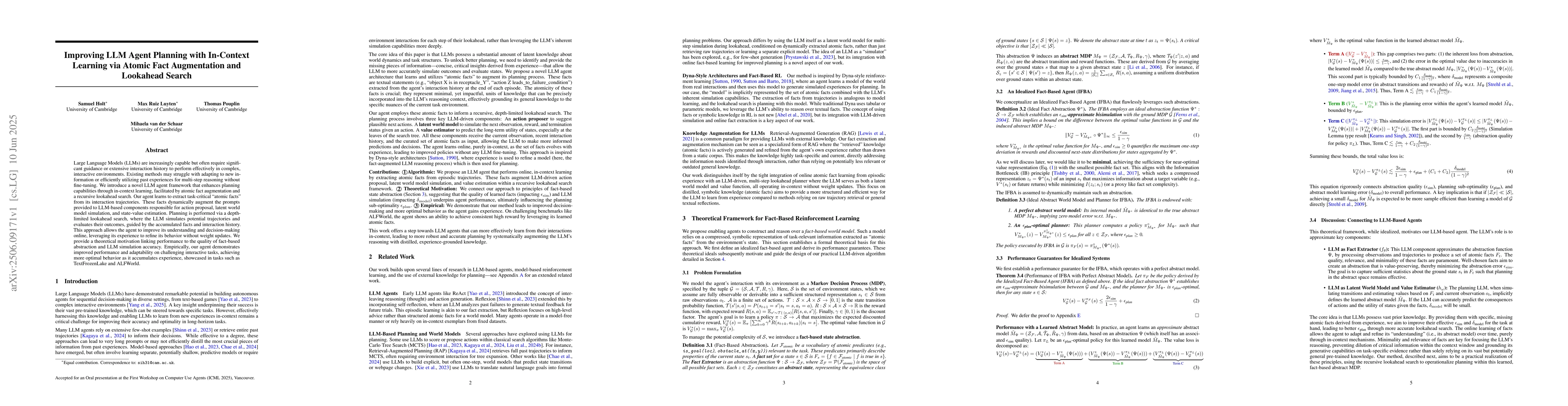 A new LLM agent framework improves planning capabilities through in-context learning via atomic fact augmentation and lookahead search, enabling online refinement of behavior without weight updates.