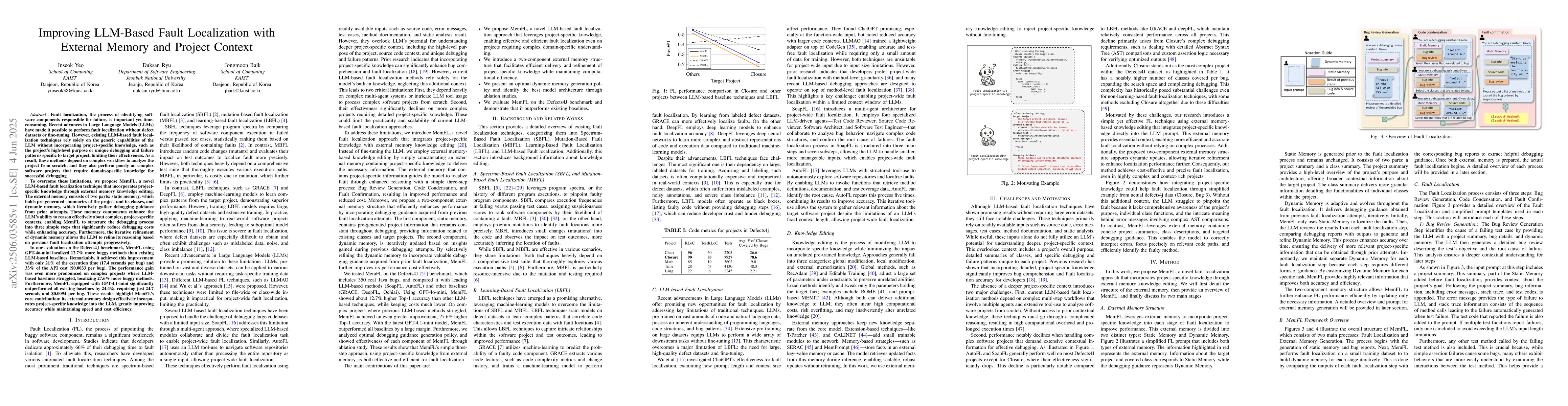 MemFL improves LLM-based fault localization with project-specific knowledge via external memory, achieving 27.6% improvement in complex projects and reducing time and cost.