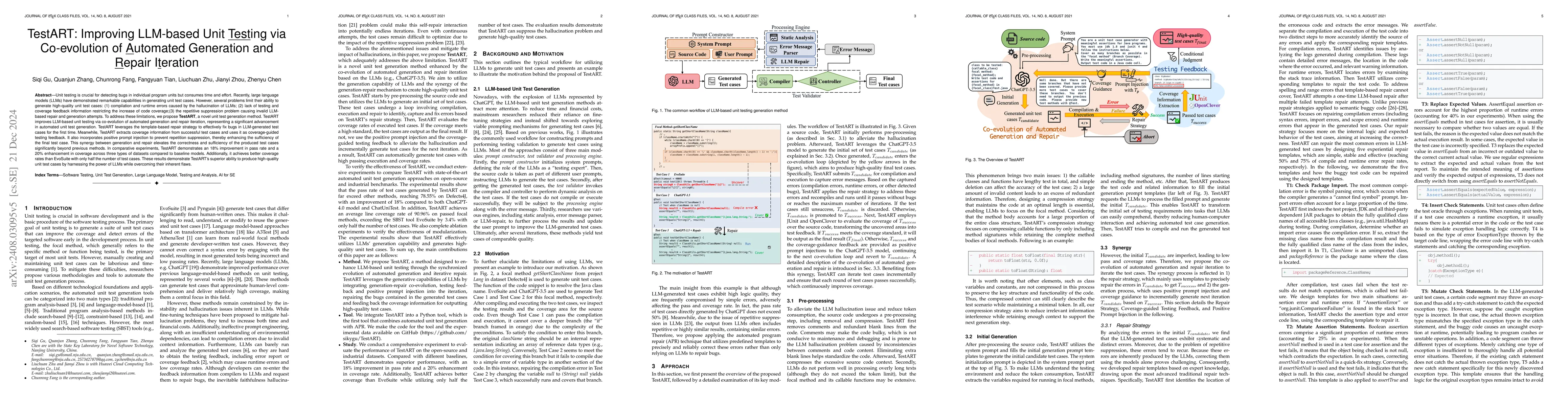 This paper introduces TestART, a method to enhance the generation of unit tests using large language models (LLMs) by integrating template-based repair techniques. It addresses issues such as invalid test cases and low coverage rates, achieving a 78.55% pass rate and 90.96% line coverage, outperforming other automated methods.
