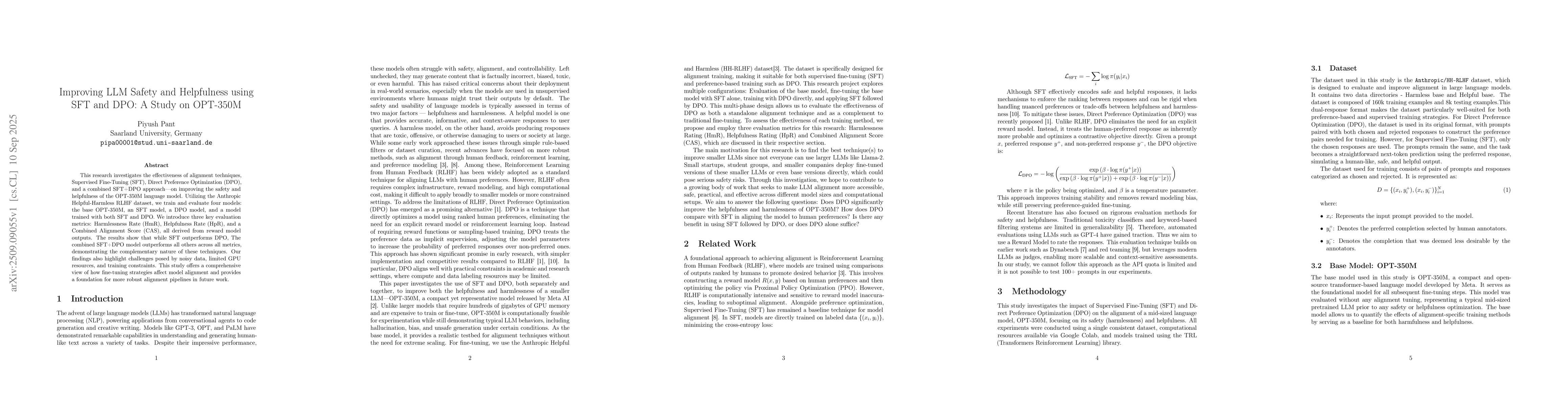 This research investigates the effectiveness of alignment techniques, Supervised Fine-Tuning (SFT), Direct Preference Optimization (DPO), and a combined SFT+DPO approach on improving the safety and helpfulness of the OPT-350M language model. Utilizing the Anthropic Helpful-Harmless RLHF dataset, we train and evaluate four models: the base OPT350M, an SFT model, a DPO model, and a model trained with both SFT and DPO. We introduce three key evaluation metrics: Harmlessness Rate (HmR), Helpfulness Rate (HpR), and a Combined Alignment Score (CAS), all derived from reward model outputs. The results show that while SFT outperforms DPO, The combined SFT+DPO model outperforms all others across all metrics, demonstrating the complementary nature of these techniques. Our findings also highlight challenges posed by noisy data, limited GPU resources, and training constraints. This study offers a comprehensive view of how fine-tuning strategies affect model alignment and provides a foundation for more robust alignment pipelines in future work.