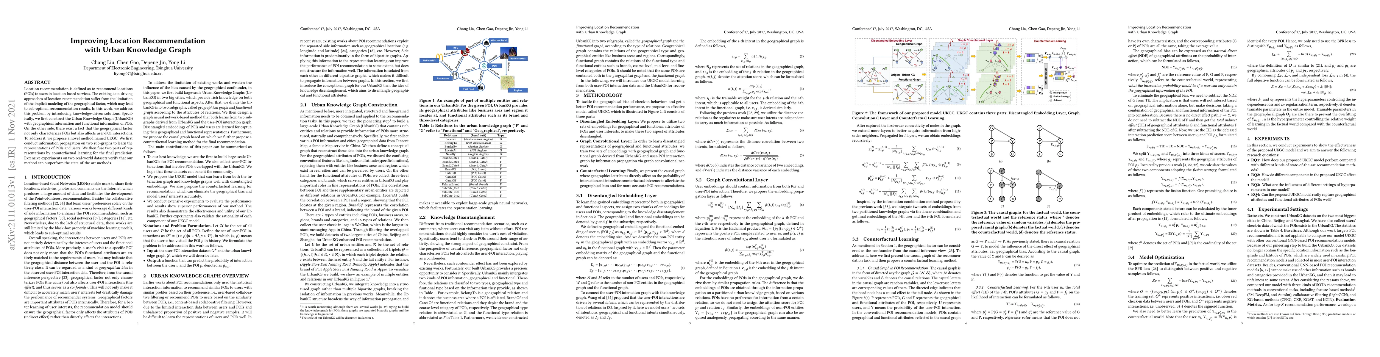 Location recommendation is defined as to recommend locations (POIs) to users in location-based services. The existing data-driving approaches of location recommendation suffer from the limitation of the implicit modeling of the geographical factor, which may lead to sub-optimal recommendation results. In this work, we address this problem by introducing knowledge-driven solutions. Specifically, we first construct the Urban Knowledge Graph (UrbanKG) with geographical information and functional information of POIs. On the other side, there exist a fact that the geographical factor not only characterizes POIs but also affects user-POI interactions. To address it, we propose a novel method named UKGC. We first conduct information propagation on two sub-graphs to learn the representations of POIs and users. We then fuse two parts of representations by counterfactual learning for the final prediction. Extensive experiments on two real-world datasets verify that our method can outperform the state-of-the-art methods.