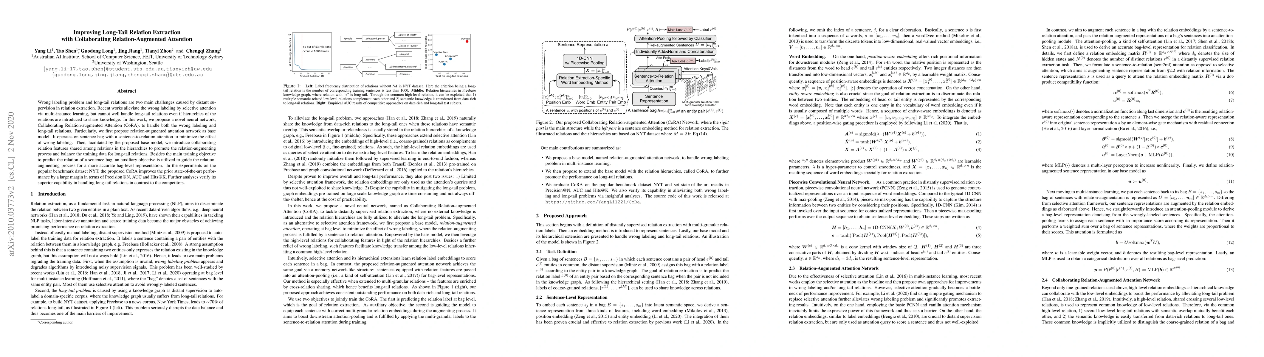This paper proposes the Collaborating Relation-augmented Attention (CoRA) network to tackle the wrong labeling and long-tail relations in relation extraction. It introduces a relation-augmented attention model and collaborative relation features to enhance performance, achieving significant improvements on benchmark datasets.