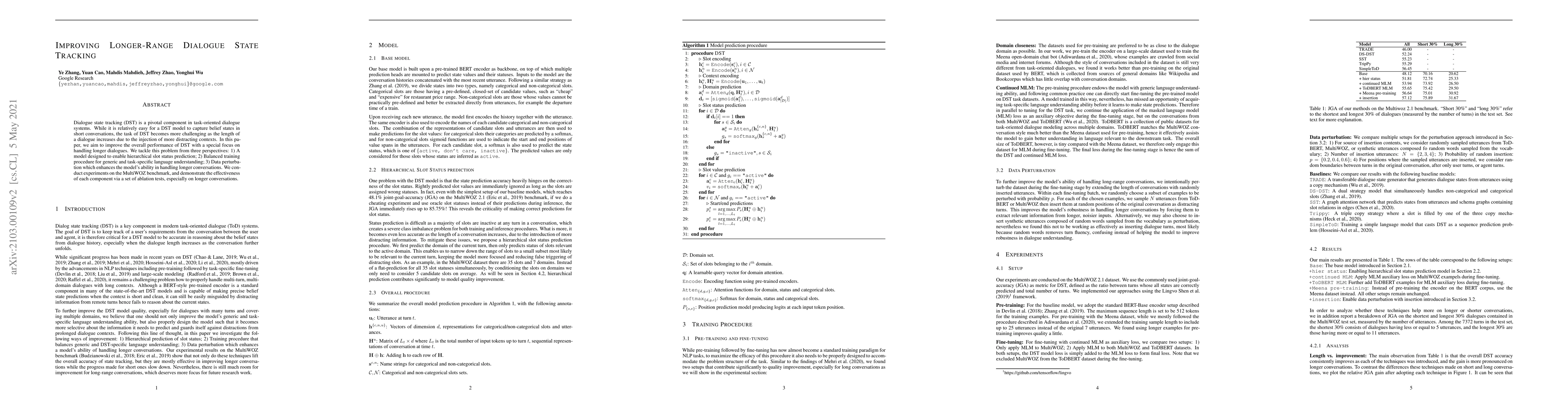 Dialogue state tracking (DST) is a pivotal component in task-oriented dialogue systems. While it is relatively easy for a DST model to capture belief states in short conversations, the task of DST becomes more challenging as the length of a dialogue increases due to the injection of more distracting contexts. In this paper, we aim to improve the overall performance of DST with a special focus on handling longer dialogues. We tackle this problem from three perspectives: 1) A model designed to enable hierarchical slot status prediction; 2) Balanced training procedure for generic and task-specific language understanding; 3) Data perturbation which enhances the model's ability in handling longer conversations. We conduct experiments on the MultiWOZ benchmark, and demonstrate the effectiveness of each component via a set of ablation tests, especially on longer conversations.
