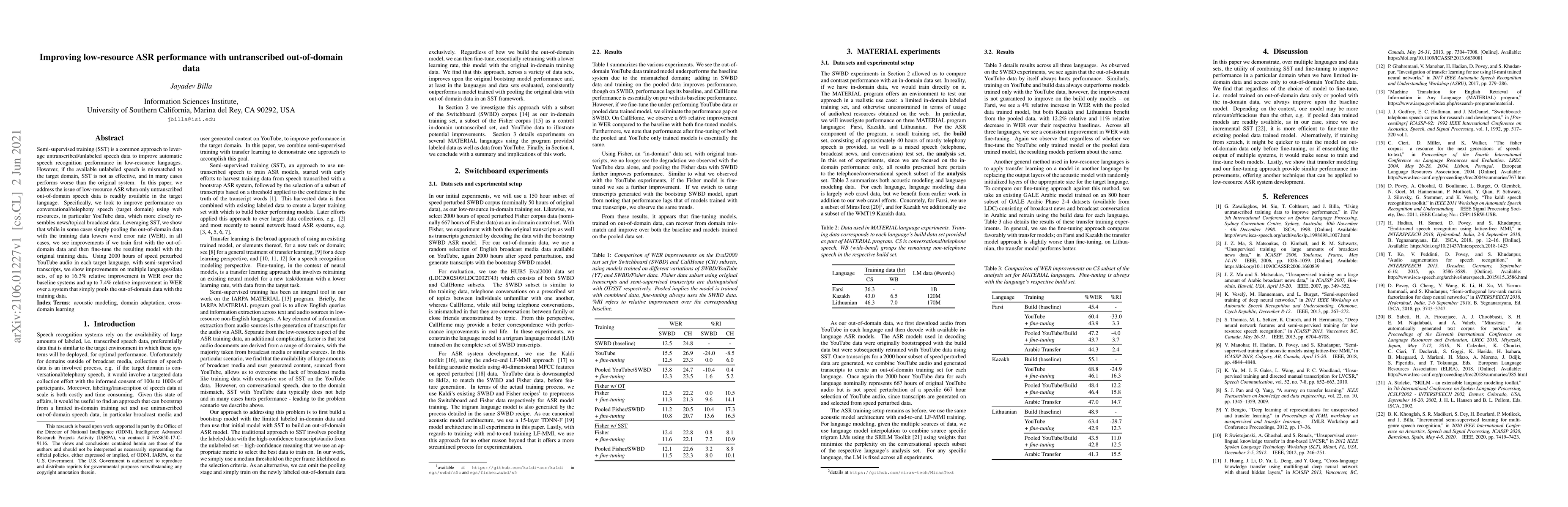 Researchers found that using untranscribed out-of-domain speech data to improve low-resource ASR performance can lead to significant gains, up to 16.3% relative improvement in word error rate, especially when fine-tuning the model with original training data.