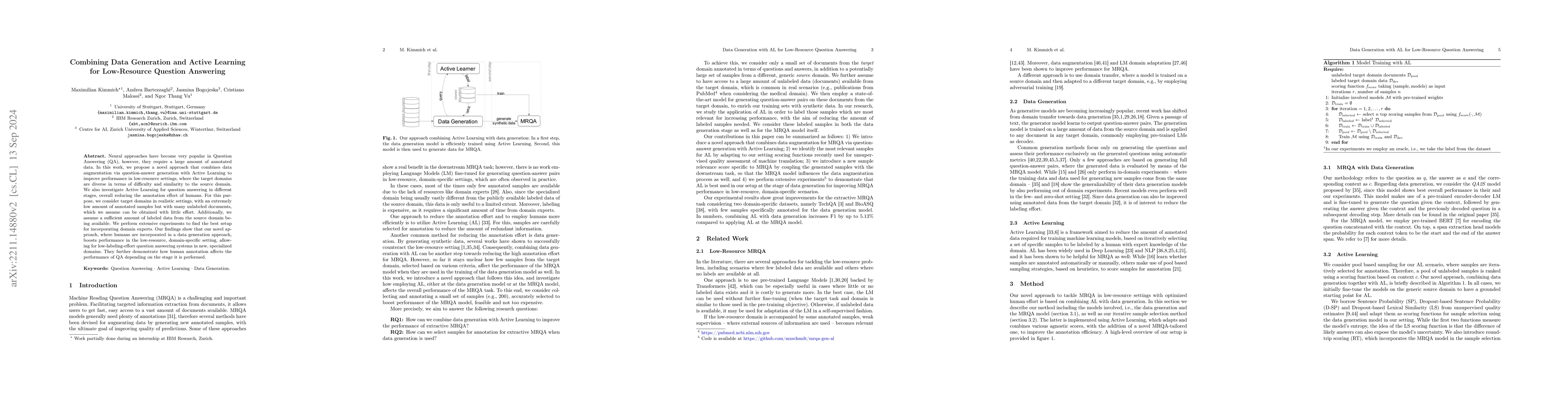Neural approaches have become very popular in the domain of Question Answering, however they require a large amount of annotated data. Furthermore, they often yield very good performance but only in the domain they were trained on. In this work we propose a novel approach that combines data augmentation via question-answer generation with Active Learning to improve performance in low resource settings, where the target domains are diverse in terms of difficulty and similarity to the source domain. We also investigate Active Learning for question answering in different stages, overall reducing the annotation effort of humans. For this purpose, we consider target domains in realistic settings, with an extremely low amount of annotated samples but with many unlabeled documents, which we assume can be obtained with little effort. Additionally, we assume sufficient amount of labeled data from the source domain is available. We perform extensive experiments to find the best setup for incorporating domain experts. Our findings show that our novel approach, where humans are incorporated as early as possible in the process, boosts performance in the low-resource, domain-specific setting, allowing for low-labeling-effort question answering systems in new, specialized domains. They further demonstrate how human annotation affects the performance of QA depending on the stage it is performed.