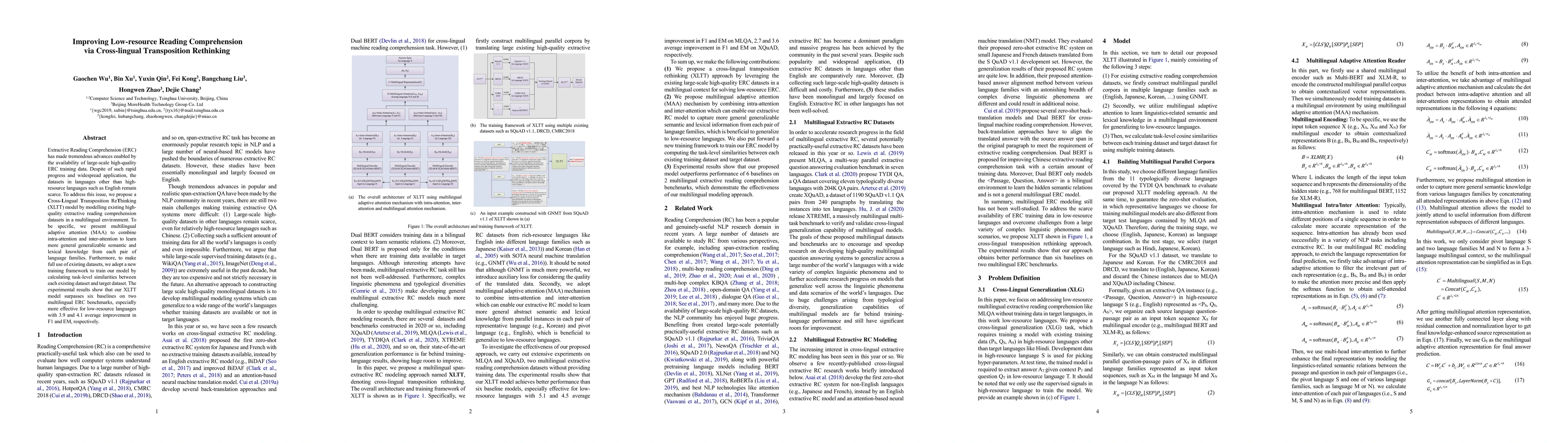 The paper proposes a Cross-Lingual Transposition ReThinking (XLTT) model to improve reading comprehension in low-resource languages by leveraging high-quality datasets from high-resource languages. The XLTT model employs multilingual adaptive attention and a new training framework to achieve better generalization and outperforms six baselines on two multilingual benchmarks, showing significant improvements in low-resource languages.