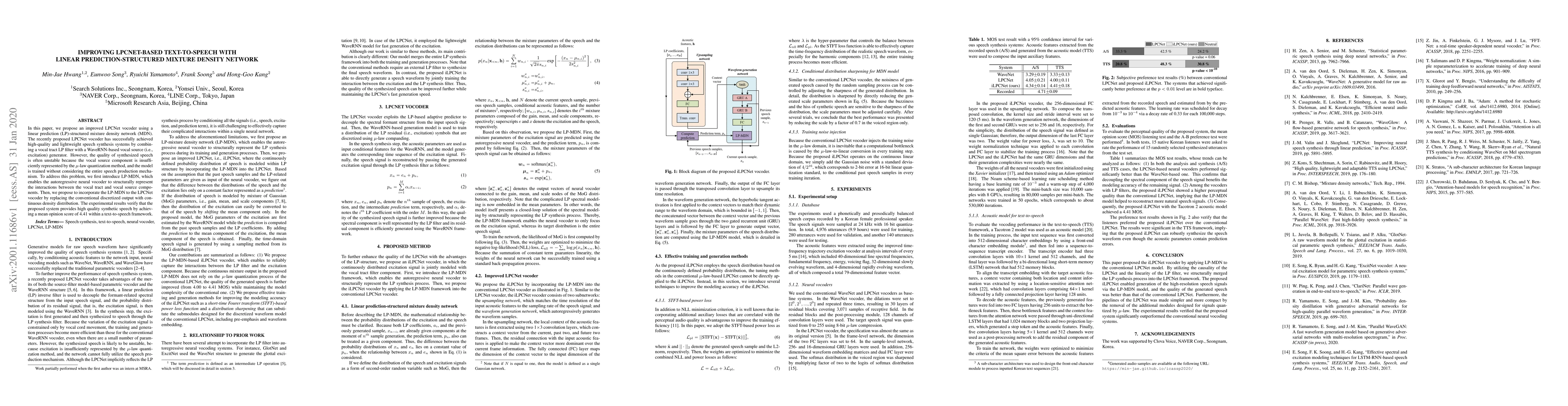 This paper proposes an enhanced LPCNet vocoder using a linear prediction-structured mixture density network (LP-MDN) to improve text-to-speech synthesis. The LP-MDN addresses instability in synthesized speech by providing a continuous density distribution, leading to higher quality synthetic speech with a mean opinion score of 4.41.