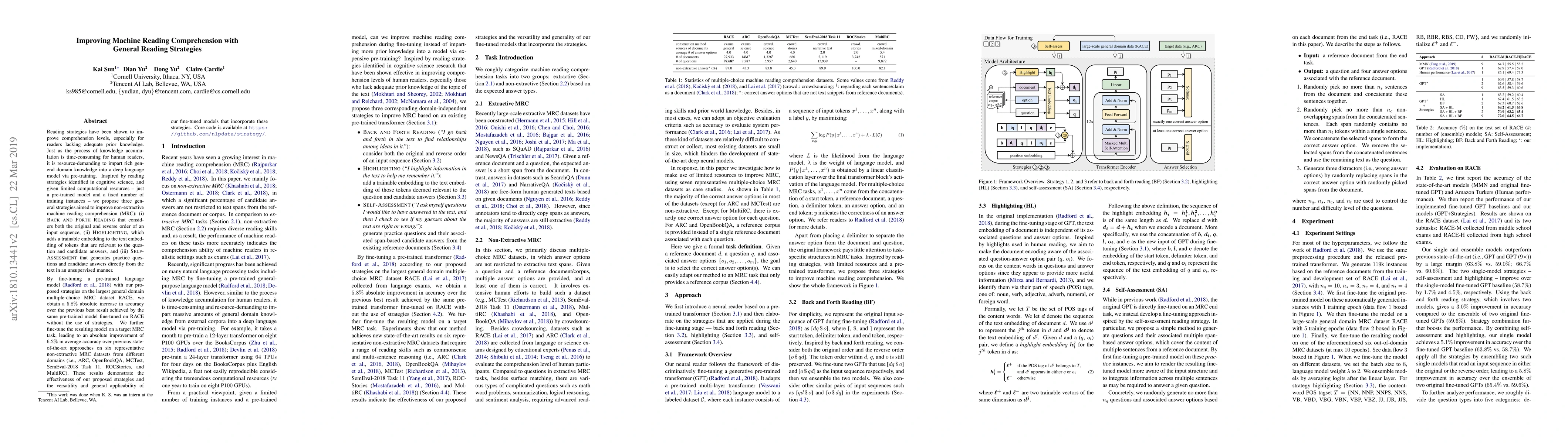 Reading strategies have been shown to improve comprehension levels, especially for readers lacking adequate prior knowledge. Just as the process of knowledge accumulation is time-consuming for human readers, it is resource-demanding to impart rich general domain knowledge into a deep language model via pre-training. Inspired by reading strategies identified in cognitive science, and given limited computational resources -- just a pre-trained model and a fixed number of training instances -- we propose three general strategies aimed to improve non-extractive machine reading comprehension (MRC): (i) BACK AND FORTH READING that considers both the original and reverse order of an input sequence, (ii) HIGHLIGHTING, which adds a trainable embedding to the text embedding of tokens that are relevant to the question and candidate answers, and (iii) SELF-ASSESSMENT that generates practice questions and candidate answers directly from the text in an unsupervised manner. By fine-tuning a pre-trained language model (Radford et al., 2018) with our proposed strategies on the largest general domain multiple-choice MRC dataset RACE, we obtain a 5.8% absolute increase in accuracy over the previous best result achieved by the same pre-trained model fine-tuned on RACE without the use of strategies. We further fine-tune the resulting model on a target MRC task, leading to an absolute improvement of 6.2% in average accuracy over previous state-of-the-art approaches on six representative non-extractive MRC datasets from different domains (i.e., ARC, OpenBookQA, MCTest, SemEval-2018 Task 11, ROCStories, and MultiRC). These results demonstrate the effectiveness of our proposed strategies and the versatility and general applicability of our fine-tuned models that incorporate these strategies. Core code is available at https://github.com/nlpdata/strategy/.