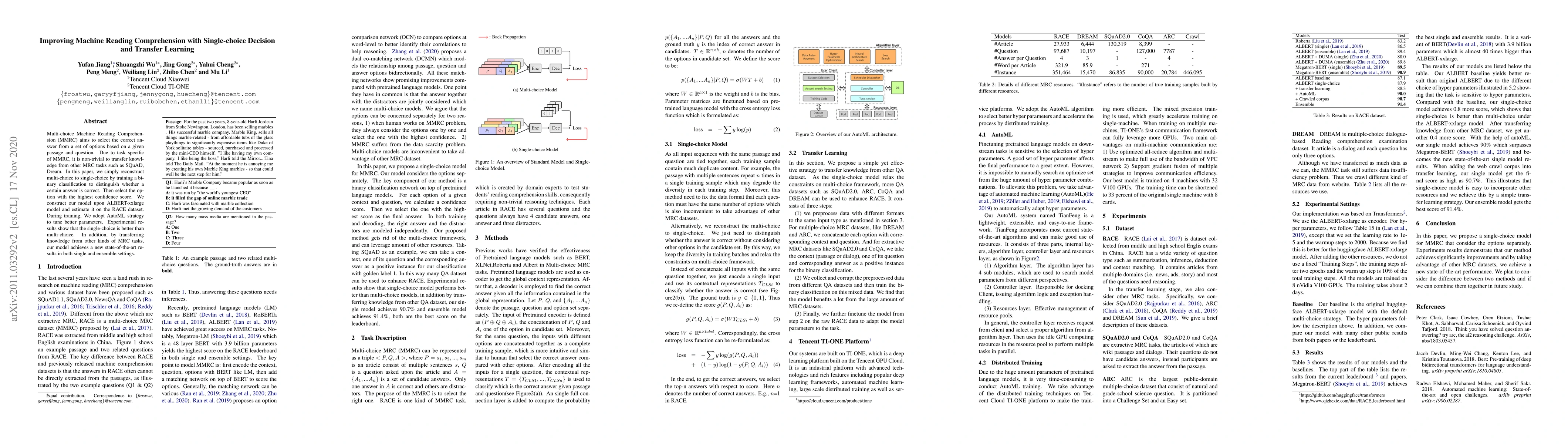 Multi-choice Machine Reading Comprehension (MMRC) aims to select the correct answer from a set of options based on a given passage and question. Due to task specific of MMRC, it is non-trivial to transfer knowledge from other MRC tasks such as SQuAD, Dream. In this paper, we simply reconstruct multi-choice to single-choice by training a binary classification to distinguish whether a certain answer is correct. Then select the option with the highest confidence score. We construct our model upon ALBERT-xxlarge model and estimate it on the RACE dataset. During training, We adopt AutoML strategy to tune better parameters. Experimental results show that the single-choice is better than multi-choice. In addition, by transferring knowledge from other kinds of MRC tasks, our model achieves a new state-of-the-art results in both single and ensemble settings.