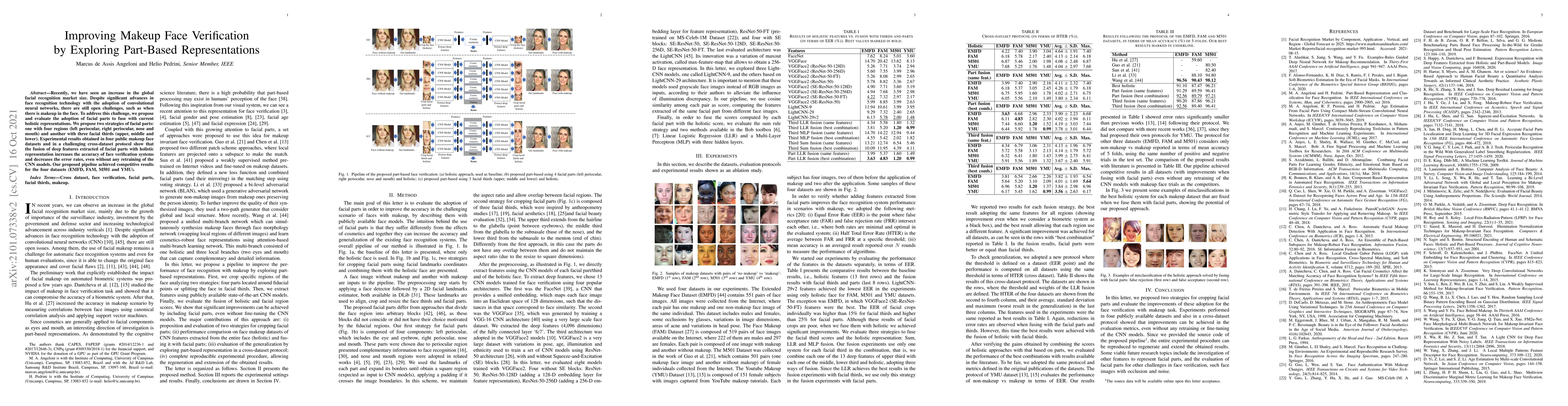 This research paper proposes innovative strategies to enhance makeup face verification by integrating part-based representations with existing holistic methods. The study demonstrates that fusing deep features from facial parts with holistic representations significantly improves accuracy and reduces error rates, achieving competitive results across multiple datasets. For detailed insights, readers are encouraged to refer to the full paper.