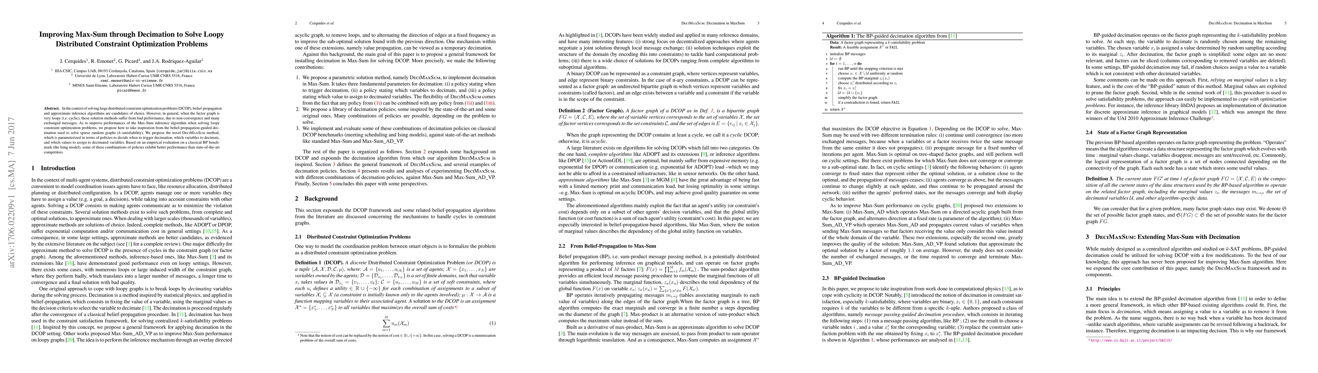 This paper proposes DeciMaxSum, a novel method to enhance the Max-Sum algorithm for solving loopy distributed constraint optimization problems (DCOP), by introducing belief-propagation-guided decimation. Empirical results on the Ising model show that certain dec-imation policies outperform existing state-of-the-art methods.