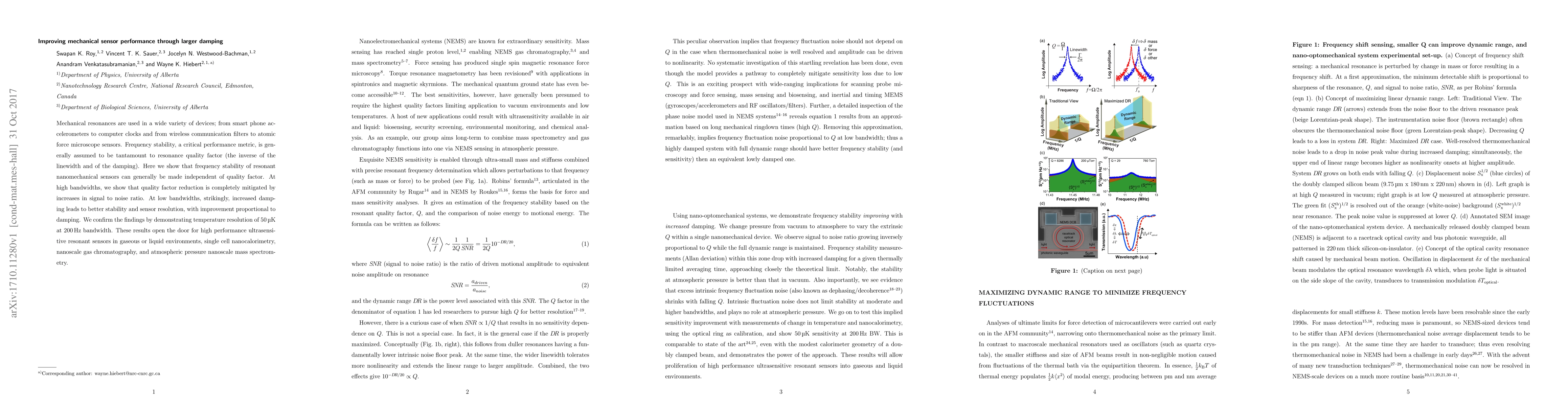 Mechanical resonances are used in a wide variety of devices; from smart phone accelerometers to computer clocks and from wireless communication filters to atomic force microscope sensors. Frequency stability, a critical performance metric, is generally assumed to be tantamount to resonance quality factor (the inverse of the linewidth and of the damping). Here we show that frequency stability of resonant nanomechanical sensors can generally be made independent of quality factor. At high bandwidths, we show that quality factor reduction is completely mitigated by increases in signal to noise ratio. At low bandwidths, strikingly, increased damping leads to better stability and sensor resolution, with improvement proportional to damping. We confirm the findings by demonstrating temperature resolution of 50 \mu K at 200 Hz bandwidth. These results open the door for high performance ultrasensitive resonant sensors in gaseous or liquid environments, single cell nanocalorimetry, nanoscale gas chromatography, and atmospheric pressure nanoscale mass spectrometry.