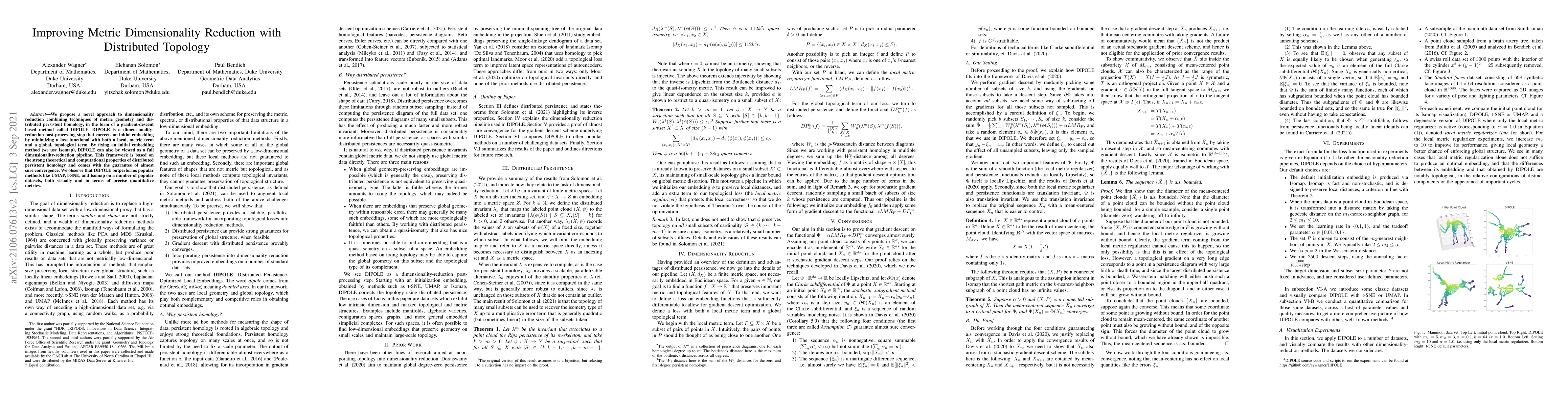 This paper introduces DIPOLE, a novel dimensionality reduction technique combining metric geometry and distributed persistent homology, which outperforms methods like UMAP, t-SNE, and Isomap on various datasets. DIPOLE leverages gradient-descent to minimize a loss functional with both local and global terms, ensuring almost sure convergence.