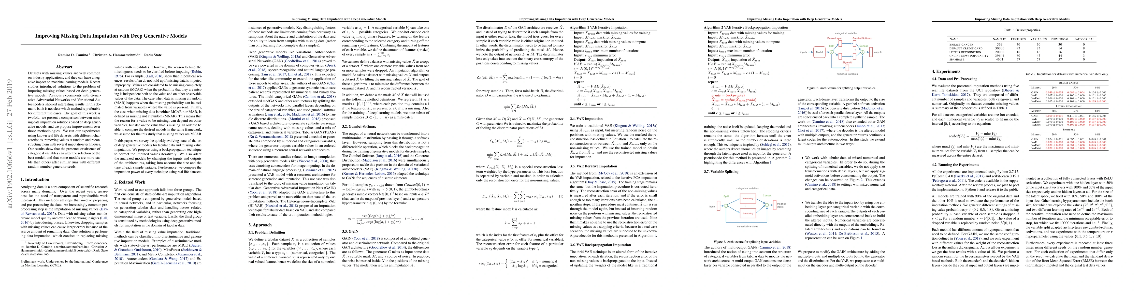Datasets with missing values are very common on industry applications, and they can have a negative impact on machine learning models. Recent studies introduced solutions to the problem of imputing missing values based on deep generative models. Previous experiments with Generative Adversarial Networks and Variational Autoencoders showed interesting results in this domain, but it is not clear which method is preferable for different use cases. The goal of this work is twofold: we present a comparison between missing data imputation solutions based on deep generative models, and we propose improvements over those methodologies. We run our experiments using known real life datasets with different characteristics, removing values at random and reconstructing them with several imputation techniques. Our results show that the presence or absence of categorical variables can alter the selection of the best model, and that some models are more stable than others after similar runs with different random number generator seeds.