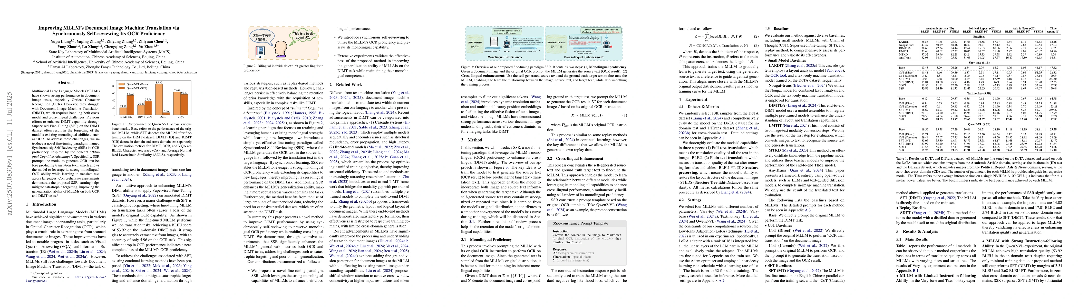Multimodal Large Language Models (MLLMs) have shown strong performance in document image tasks, especially Optical Character Recognition (OCR). However, they struggle with Document Image Machine Translation (DIMT), which requires handling both cross-modal and cross-lingual challenges. Previous efforts to enhance DIMT capability through Supervised Fine-Tuning (SFT) on the DIMT dataset often result in the forgetting of the model's existing monolingual abilities, such as OCR. To address these challenges, we introduce a novel fine-tuning paradigm, named Synchronously Self-Reviewing (SSR) its OCR proficiency, inspired by the concept "Bilingual Cognitive Advantage". Specifically, SSR prompts the model to generate OCR text before producing translation text, which allows the model to leverage its strong monolingual OCR ability while learning to translate text across languages. Comprehensive experiments demonstrate the proposed SSR learning helps mitigate catastrophic forgetting, improving the generalization ability of MLLMs on both OCR and DIMT tasks.
