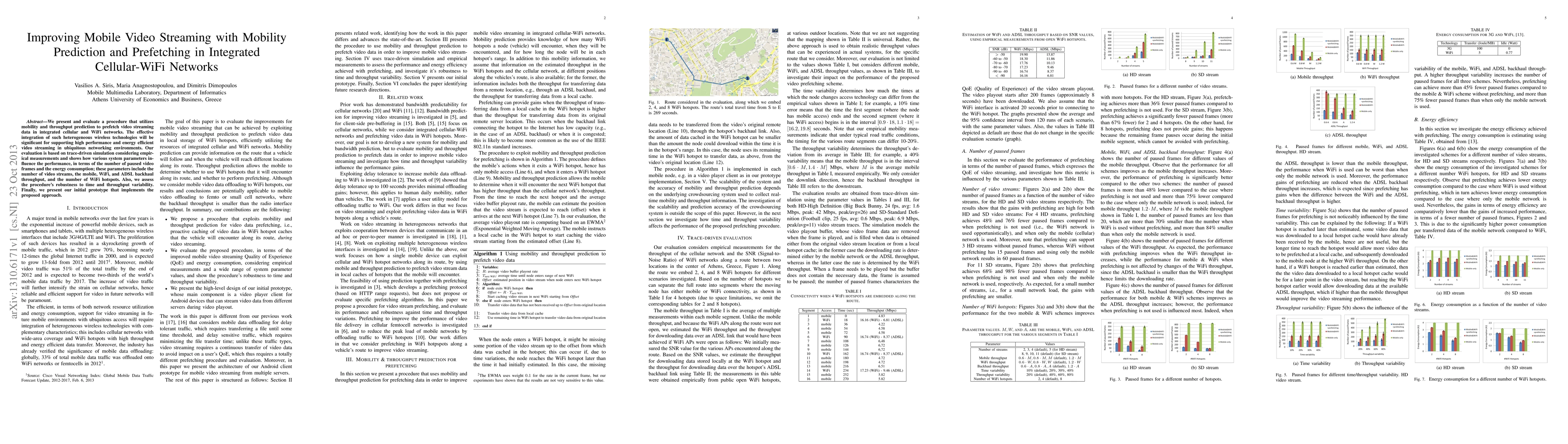 This paper proposes a method to enhance mobile video streaming by using mobility and throughput prediction to prefetch data in integrated cellular and WiFi networks. Simulation results show that the approach effectively reduces paused video frames and energy consumption, while an initial prototype demonstrates its feasibility.