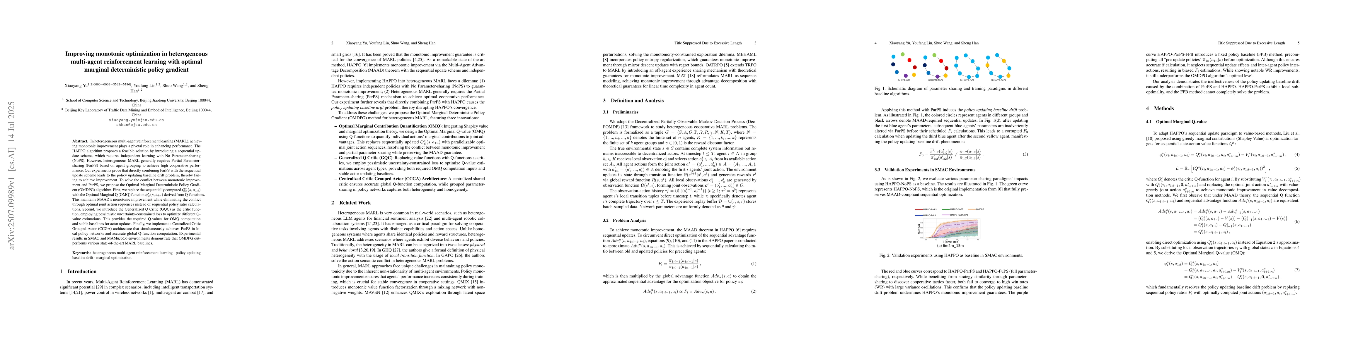 The paper introduces the Optimal Marginal Deterministic Policy Gradient (OMDPG) algorithm to resolve conflicts between monotonic improvement and Partial Parameter-sharing (ParPS) in heterogeneous multi-agent reinforcement learning. OMDPG replaces sequential policy ratio calculations with an Optimal Marginal Q function and uses a Generalized Q Critic with uncertainty-constrained loss. It also implements a Centralized Critic Grouped Actor architecture, resulting in improved performance over existing MARL baselines in SMAC and MAMuJoCo environments.