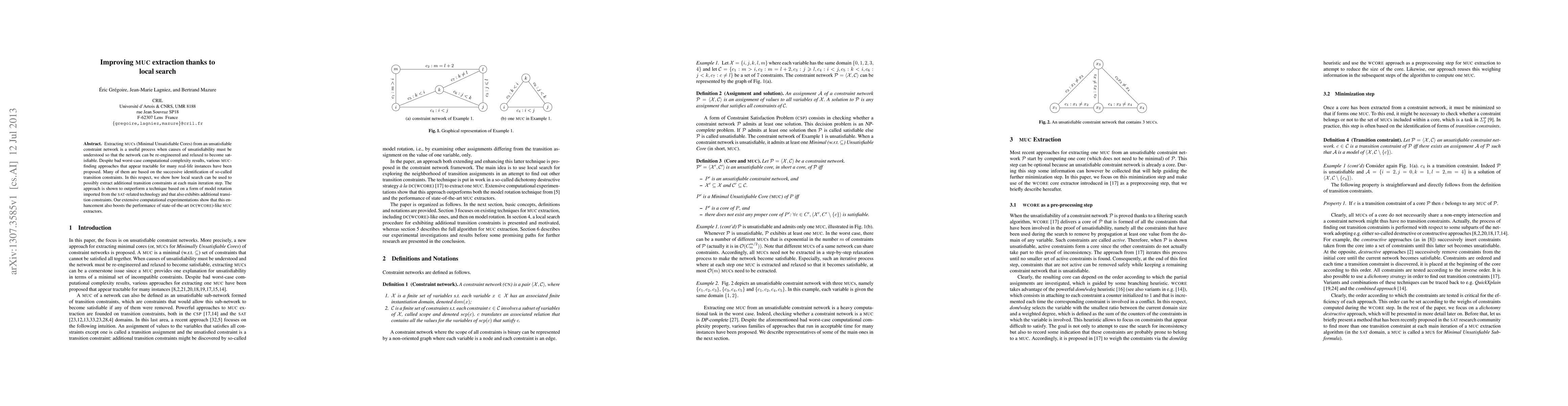 ExtractingMUCs(MinimalUnsatisfiableCores)fromanunsatisfiable constraint network is a useful process when causes of unsatisfiability must be understood so that the network can be re-engineered and relaxed to become sat- isfiable. Despite bad worst-case computational complexity results, various MUC- finding approaches that appear tractable for many real-life instances have been proposed. Many of them are based on the successive identification of so-called transition constraints. In this respect, we show how local search can be used to possibly extract additional transition constraints at each main iteration step. The approach is shown to outperform a technique based on a form of model rotation imported from the SAT-related technology and that also exhibits additional transi- tion constraints. Our extensive computational experimentations show that this en- hancement also boosts the performance of state-of-the-art DC(WCORE)-like MUC extractors.
