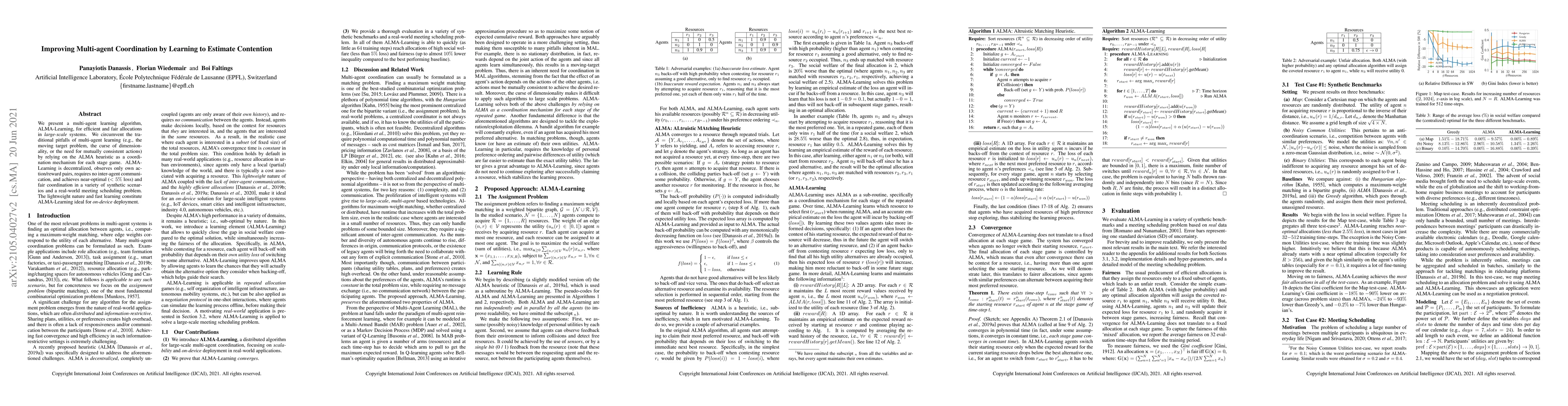 We present a multi-agent learning algorithm, ALMA-Learning, for efficient and fair allocations in large-scale systems. We circumvent the traditional pitfalls of multi-agent learning (e.g., the moving target problem, the curse of dimensionality, or the need for mutually consistent actions) by relying on the ALMA heuristic as a coordination mechanism for each stage game. ALMA-Learning is decentralized, observes only own action/reward pairs, requires no inter-agent communication, and achieves near-optimal (<5% loss) and fair coordination in a variety of synthetic scenarios and a real-world meeting scheduling problem. The lightweight nature and fast learning constitute ALMA-Learning ideal for on-device deployment.