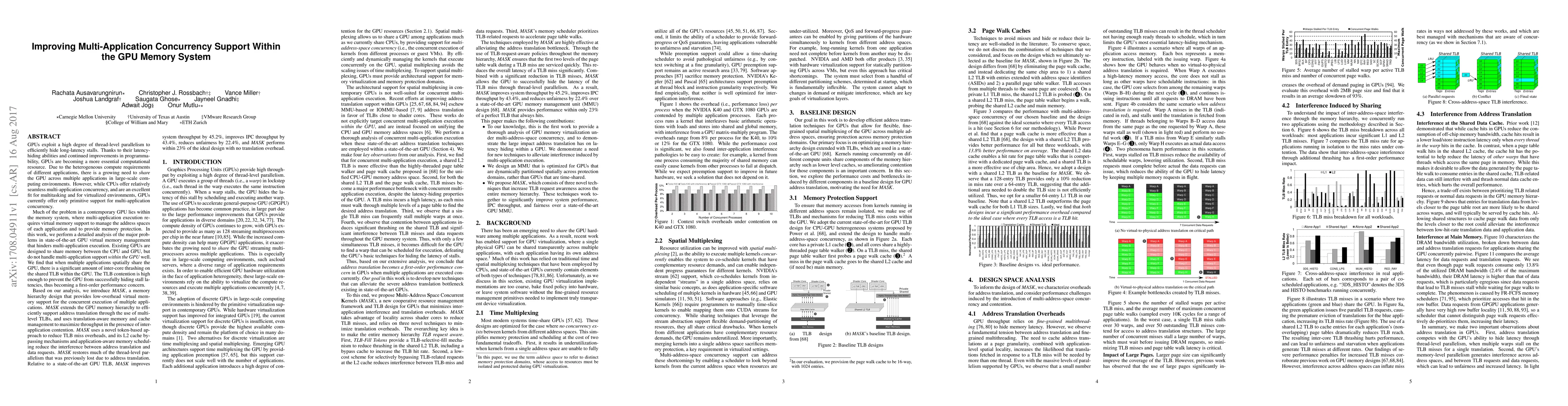 This paper analyzes the challenges of multi-application concurrency within GPU memory systems, especially the high TLB contention affecting performance. It proposes MASK, a novel memory hierarchy design with multi-level TLBs and translation-aware management to enhance concurrent execution of multiple applications on GPUs.